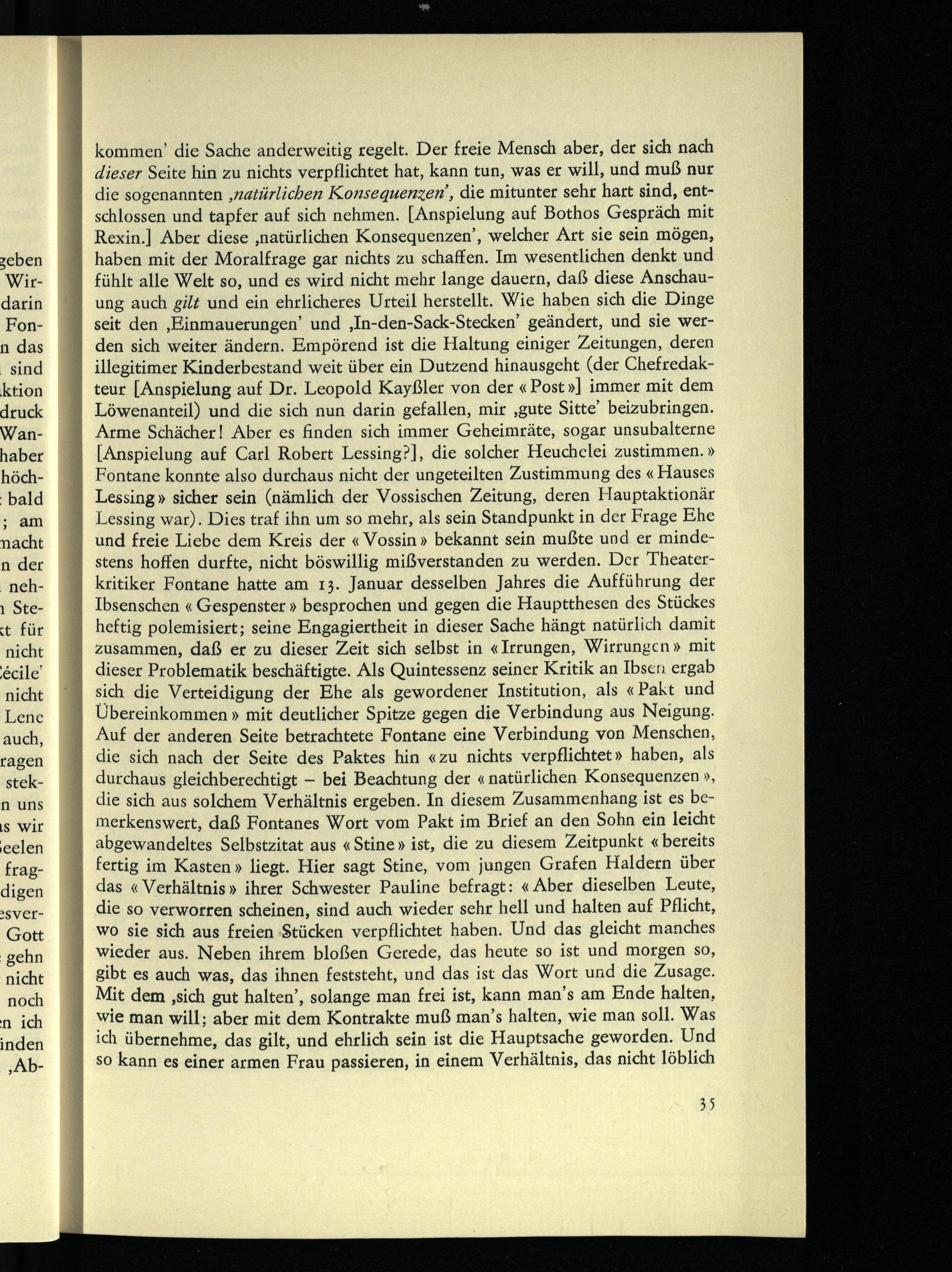 kommen’ die Sache anderweitig regelt. Der freie Mensch aber, der sich nach dieser Seite hin zu nichts verpflichtet hat, kann tun, was er will, und muß nur die sogenannten ,natürlichen Konsequenzen, die mitunter sehr hart sind, entschlossen und tapfer auf sich nehmen. [Anspielung auf Bothos Gespräch mit Rexin.] Aber diese natürlichen Konsequenzen’, welcher Art sie sein mögen, haben mit der Moralfrage gar nichts zu schaffen. Im wesentlichen denkt und fühlt alle Welt so, und es wird nicht mehr lange dauern, daß diese Anschauung auch gilt und ein ehrlicheres Urteil herstellt. Wie haben sich die Dinge seit den .Einmauerungen’ und ,In-den-Sack-Stecken’ geändert, und sie werden sich weiter ändern. Empörend ist die Haltung einiger Zeitungen, deren illegitimer Kinderbestand weit über ein Dutzend hinausgeht (der Chefredakteur [Anspielung auf Dr. Leopold Kayßler von der « Post»] immer mit dem Löwenanteil) und die sich nun darin gefallen, mir .gute Sitte’ beizubringen. Arme Schächer! Aber es finden sich immer Geheimräte, sogar unsubalterne [Anspielung auf Carl Robert Lessing?], die solcher Heuchelei zustimmen.» Fontane konnte also durchaus nicht der ungeteilten Zustimmung des «Hauses Lessing» sicher sein (nämlich der Vossischen Zeitung, deren Hauptaktionär Lessing war). Dies traf ihn um so mehr, als sein Standpunkt in der Frage Ehe und freie Liebe dem Kreis der «Vossin» bekannt sein mußte und er mindestens hoffen durfte, nicht böswillig mißverstanden zu werden. Der Theaterkritiker Fontane hatte am 13. Januar desselben Jahres die Aufführung der Ibsenschen « Gespenster » besprochen und gegen die Hauptthesen des Stückes heftig polemisiert; seine Engagiertheit in dieser Sache hängt natürlich damit zusammen, daß er zu dieser Zeit sich selbst in «Irrungen, Wirrungen» mit dieser Problematik beschäftigte. Als Quintessenz seiner Kritik an Ibsen ergab sich die Verteidigung der Ehe als gewordener Institution, als «Pakt und Übereinkommen » mit deutlicher Spitze gegen die Verbindung aus Neigung. Auf der anderen Seite betrachtete Fontane eine Verbindung von Menschen, die sich nach der Seite des Paktes hin «zu nichts verpflichtet» haben, als durchaus gleichberechtigt - bei Beachtung der « natürlichen Konsequenzen », die sich aus solchem Verhältnis ergeben. In diesem Zusammenhang ist es bemerkenswert, daß Fontanes Wort vom Pakt im Brief an den Sohn ein leicht abgewandeltes Selbstzitat aus « Stine » ist, die zu diesem Zeitpunkt « bereits fertig im Kasten » liegt. Hier sagt Stine, vom jungen Grafen Haldern über das «Verhältnis» ihrer Schwester Pauline befragt: «Aber dieselben Leute, die so verworren scheinen, sind auch wieder sehr hell und halten auf Pflicht, wo sie sich aus freien Stücken verpflichtet haben. Und das gleicht manches wieder aus. Neben ihrem bloßen Gerede, das heute so ist und morgen so, gibt es auch was, das ihnen feststeht, und das ist das Wort und die Zusage. Mit dem .sich gut halten’, solange man frei ist, kann man’s am Ende halten, wie man will; aber mit dem Kontrakte muß man’s halten, wie man soll. Was ich übernehme, das gilt, und ehrlich sein ist die Hauptsache geworden. Und so kann es einer armen Frau passieren, in einem Verhältnis, das nicht löblich