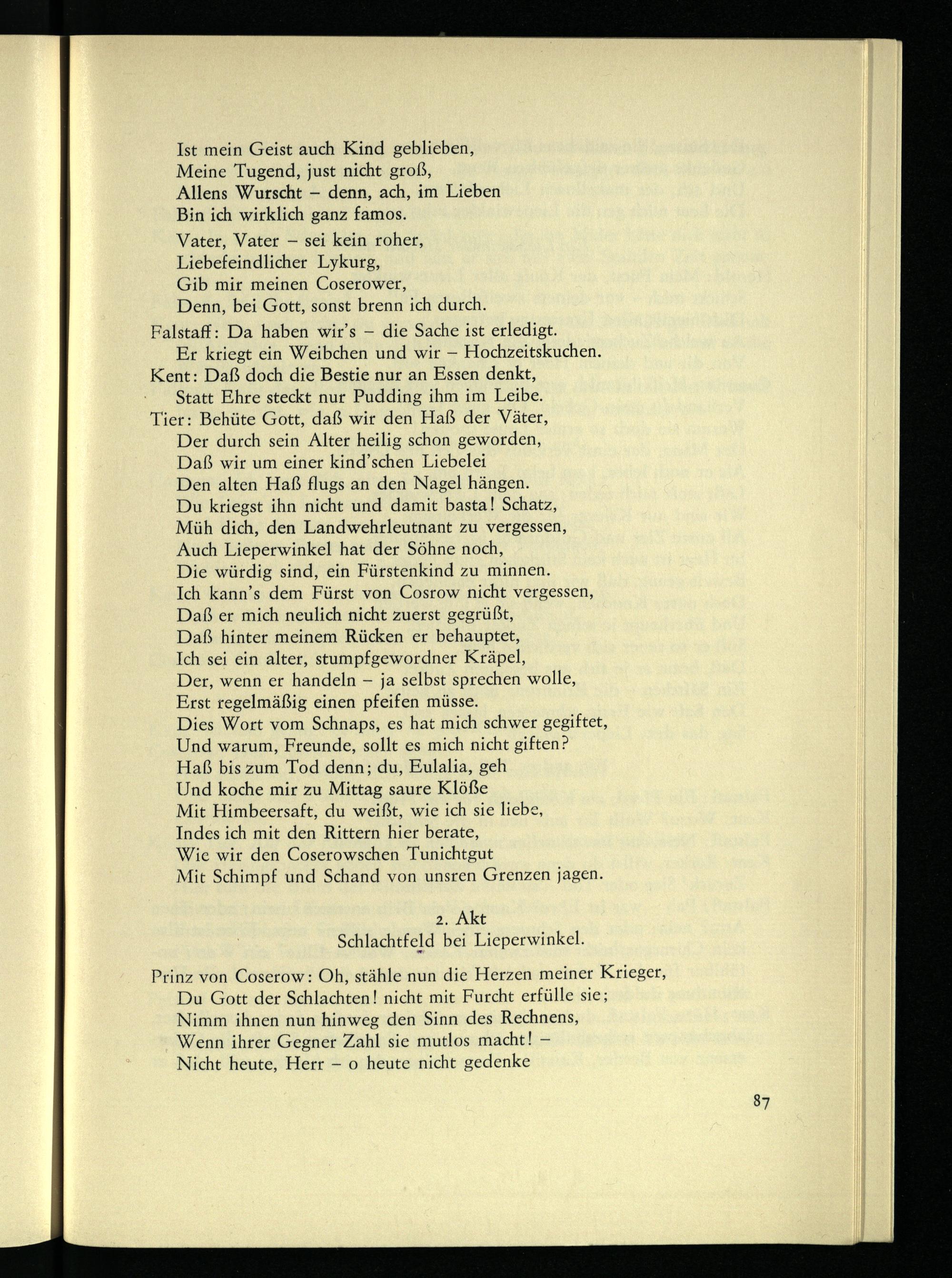 Haß bis zum Tod denn; du, Eulalia, geh Und koche mir zu Mittag saure Klöße Mit Himbeersaft, du weißt, wie ich sie liebe,