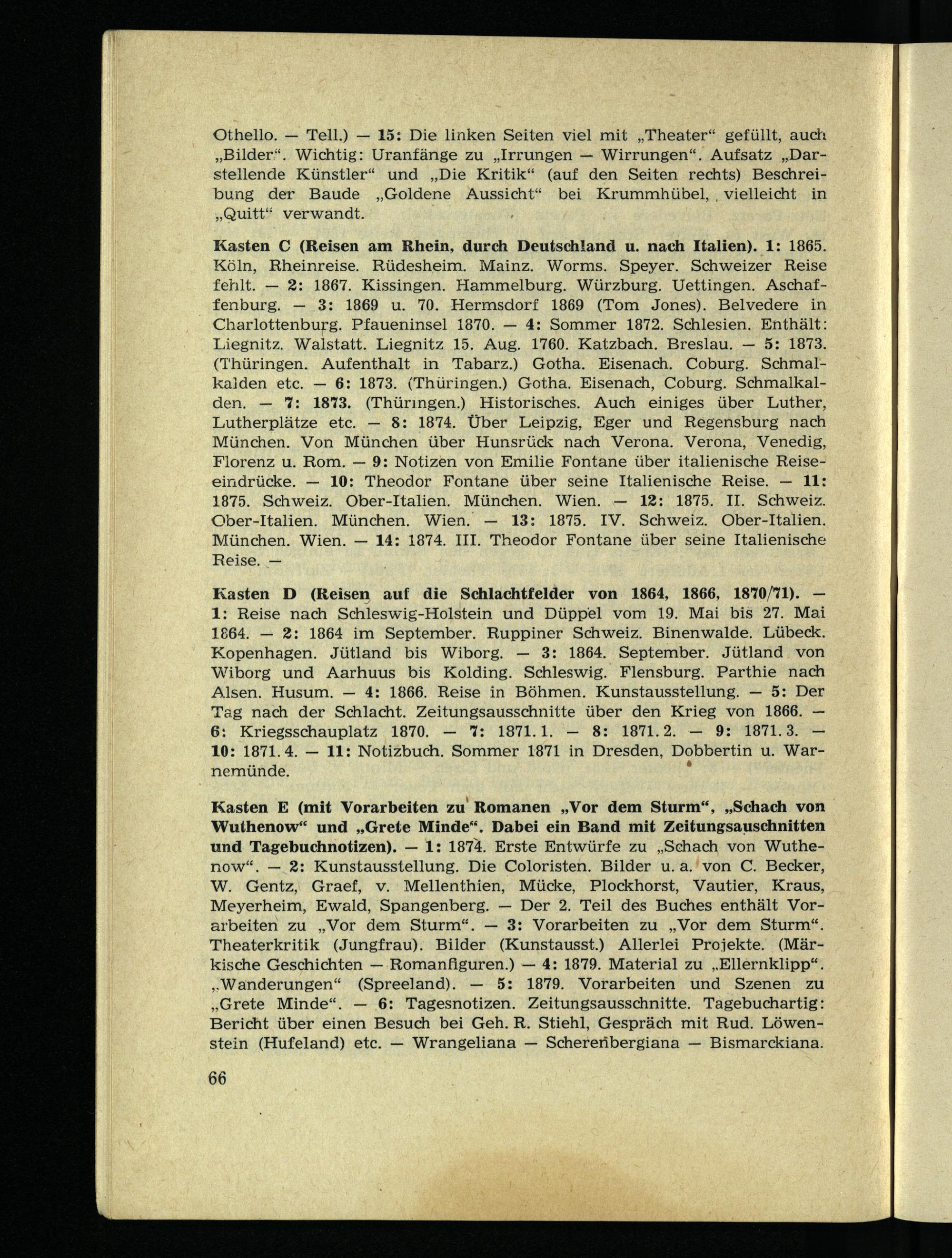 Köln, Rheinreise. Rüdesheim. Mainz. Worms. Speyer. Schweizer Reise fehlt. — 2: 1867. Kissingen. Hammelburg. Würzburg. Uettingen. Aschaffenburg. — 3: 1869 u. 70. Hermsdorf 1869 (Tom Jones). Belvedere in Charlottenburg. Pfaueninsel 1870. — 4: Sommer 1872. Schlesien. Enthält: Liegnitz. Walstatt. Liegnitz 15. Aug. 1760. Katzbach. Breslau. — 5: 1873. (Thüringen. Aufenthalt in Tabarz.) Gotha. Eisenach. Coburg. Schmalkalden etc. — 6: 1873. (Thüringen.) Gotha. Eisenach, Coburg. Schmalkalden. — 7: 1873. (Thüringen.) Historisches. Auch einiges über Luther, Lutherplätze etc. — 8: 1874. Über Leipzig, Eger und Regensburg nach München. Von München über Hunsrück nach Verona. Verona, Venedig, Florenz u. Rom. — 9: Notizen von Emilie Fontane über italienische Reiseeindrücke. — 10: Theodor Fontane über seine Italienische Reise. — 11: 1875. Schweiz. Ober-Italien. München. Wien. — 12: 1875. II. Schweiz. Ober-Italien. München. Wien. — 13: 1875. IV. Schweiz. Ober-Italien. München. Wien. — 14: 1874. III. Theodor Fontane über seine Italienische Reise. —