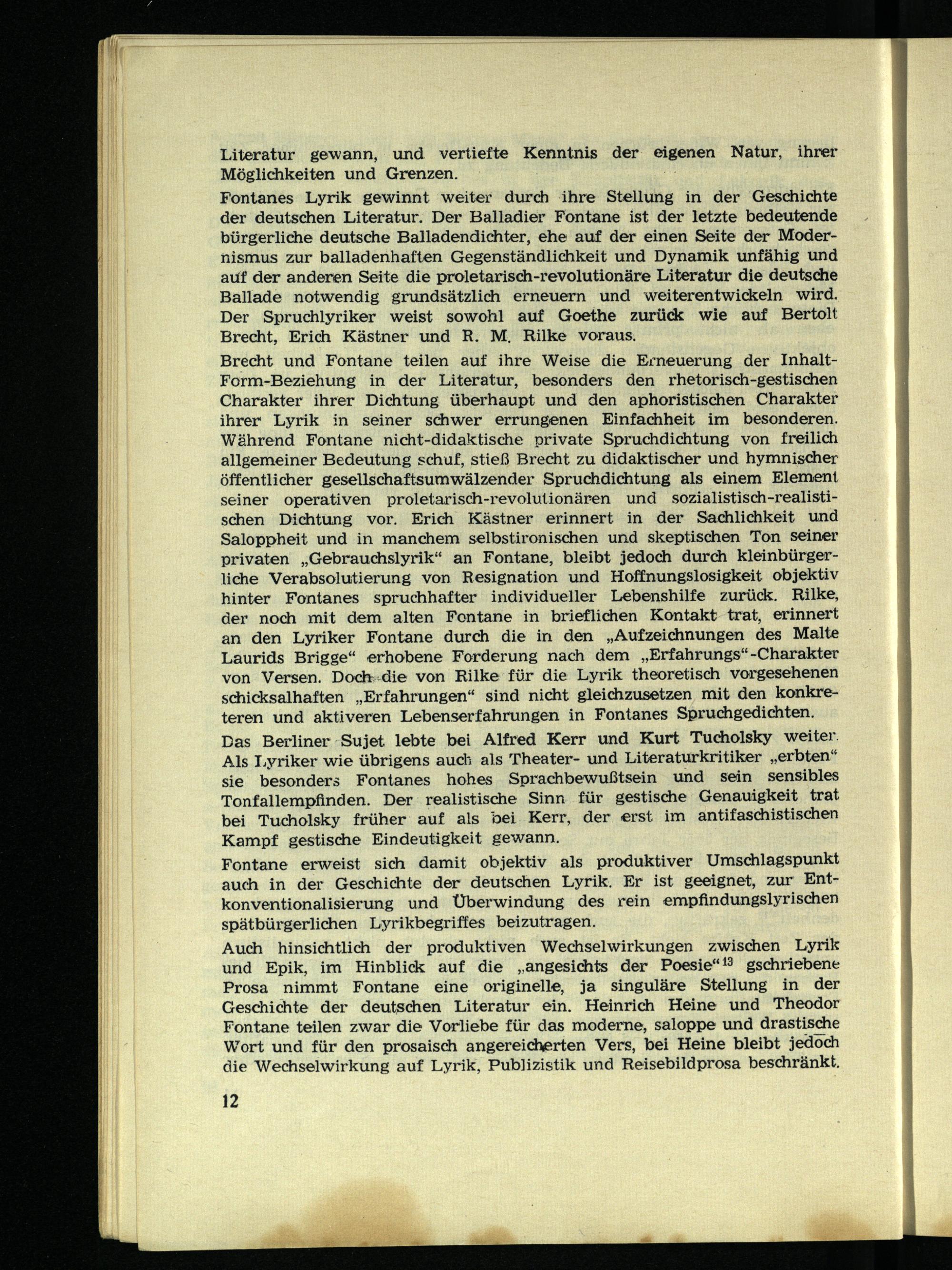 Fontane erweist sich damit objektiv als produktiver Umschlagspunkt auch in der Geschichte der deutschen Lyrik. Er ist geeignet, zur Ent- konventionalisierung und Überwindung des rein empfindungslyrischen spätbürgerlichen Lyrikbegriffes beizutragen.