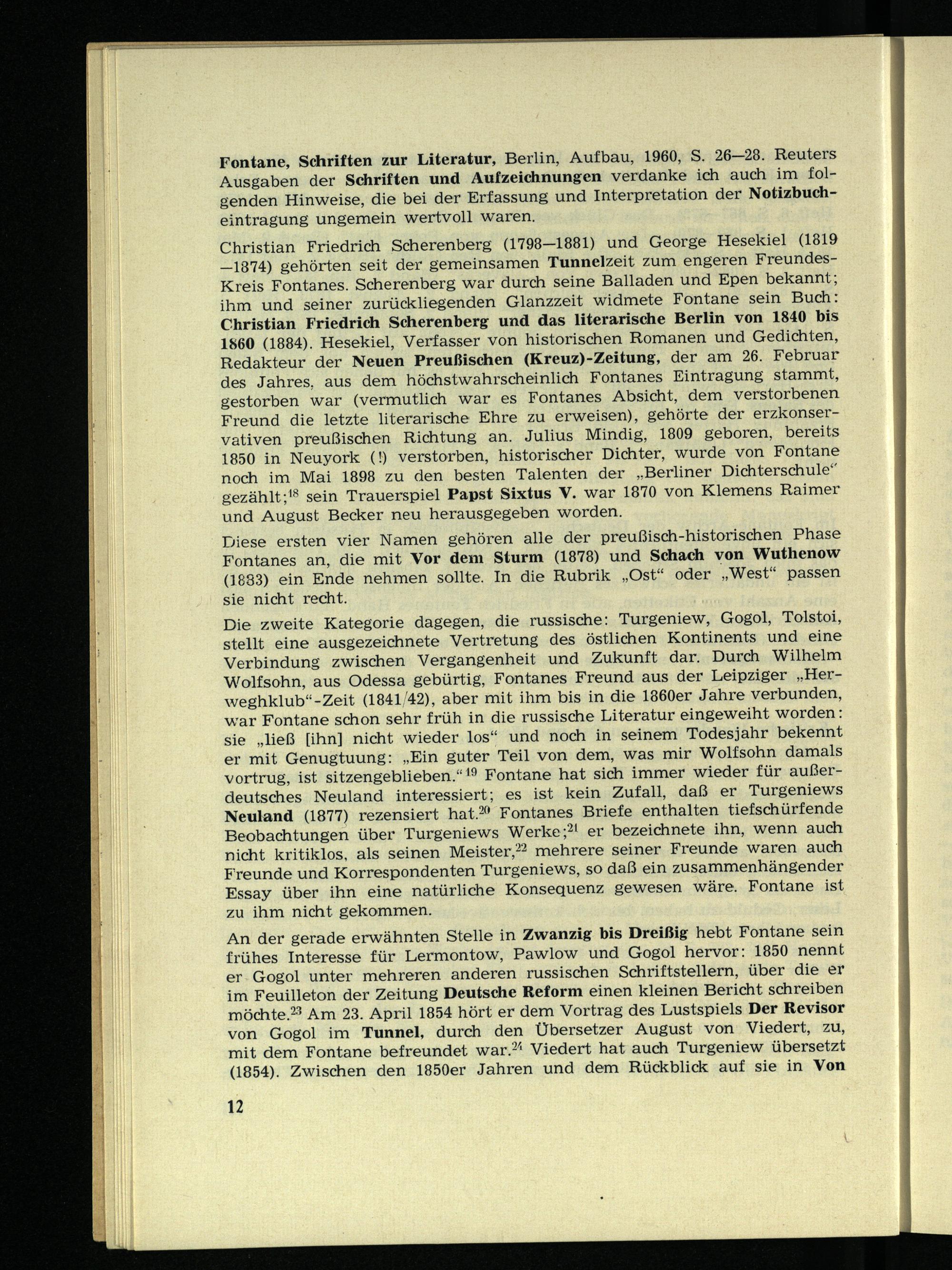 An der gerade erwähnten Stelle in Zwanzig bis Dreißig hebt Fontane sein frühes Interesse für Lermontow, Pawlow und Gogol hervor: 1850 nennt er Gogol unter mehreren anderen russischen Schriftstellern, über die er im Feuilleton der Zeitung Deutsche Reform einen kleinen Bericht schreiben möchte. 23 Am 23. April 1854 hört er dem Vortrag des Lustspiels Der Revisor von Gogol im Tunnel, durch den Übersetzer August von Viedert, zu, mit dem Fontane befreundet war. 2 ' 1 Viedert hat auch Turgeniew übersetzt (1854). Zwischen den 1850er Jahren und dem Rückblick auf sie in Von