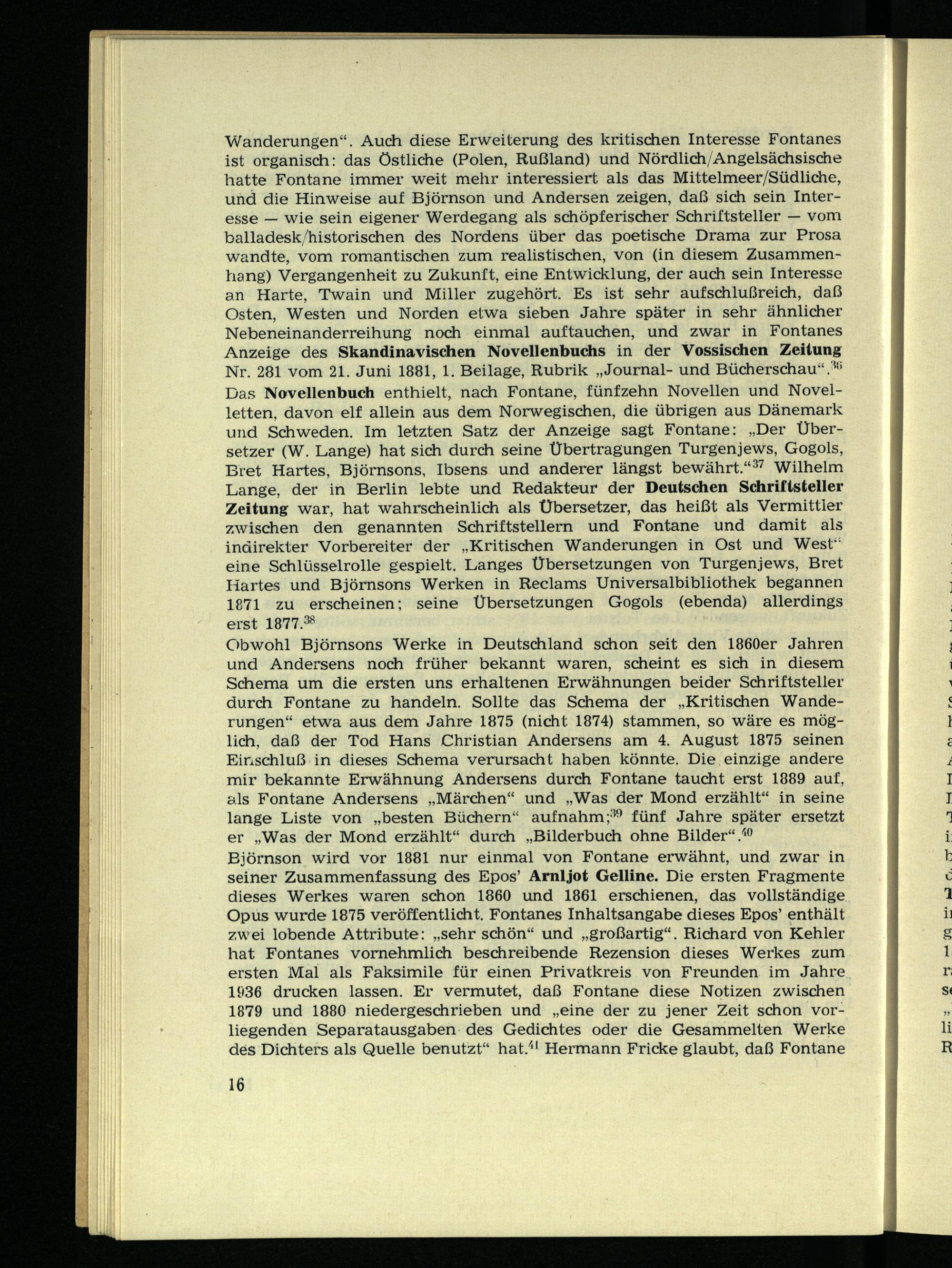 Wanderungen“. Auch diese Erweiterung des kritischen Interesse Fontanes ist organisch: das östliche (Polen, Rußland) und Nördlich/Angelsächsische hatte Fontane immer weit mehr interessiert als das Mittelmeer/Südliche, und die Hinweise auf Björnson und Andersen zeigen, daß sich sein Interesse — wie sein eigener Werdegang als schöpferischer Schriftsteller — vom balladesk/historischen des Nordens über das poetische Drama zur Prosa wandte, vom romantischen zum realistischen, von (in diesem Zusammenhang) Vergangenheit zu Zukunft, eine Entwicklung, der auch sein Interesse an Harte, Twain und Miller zugehört. Es ist sehr aufschlußreich, daß Osten, Westen und Norden etwa sieben Jahre später in sehr ähnlicher Nebeneinanderreihung noch einmal auf tauchen, und zwar in Fontanes Anzeige des Skandinavischen Novellenbuchs in der Vossischen Zeitung Nr. 281 vom 21. Juni 1881, 1. Beilage, Rubrik „Journal- und Bücherschau“. 30 Das Novellenbuch enthielt, nach Fontane, fünfzehn Novellen und Novel- letten, davon elf allein aus dem Norwegischen, die übrigen aus Dänemark und Schweden. Im letzten Satz der Anzeige sagt Fontane: „Der Übersetzer (W. Dange) hat sich durch seine Übertragungen Turgenjews, Gogols, Biet Hartes, Björnsons, Ibsens und anderer längst bewährt.“ 37 Wilhelm Lange, der in Berlin lebte und Redakteur der Deutschen Schriftsteller Zeitung war, hat wahrscheinlich als Übersetzer, das heißt als Vermittler zwischen den genannten Schriftstellern und Fontane und damit als indirekter Vorbereiter der „Kritischen Wanderungen in Ost und West“ eine Schlüsselrolle gespielt. Langes Übersetzungen von Turgenjews, Bret Hartes und Björnsons Werken in Reclams Universalbibliothek begannen 1871 zu erscheinen; seine Übersetzungen Gogols (ebenda) allerdings erst 1877. 38