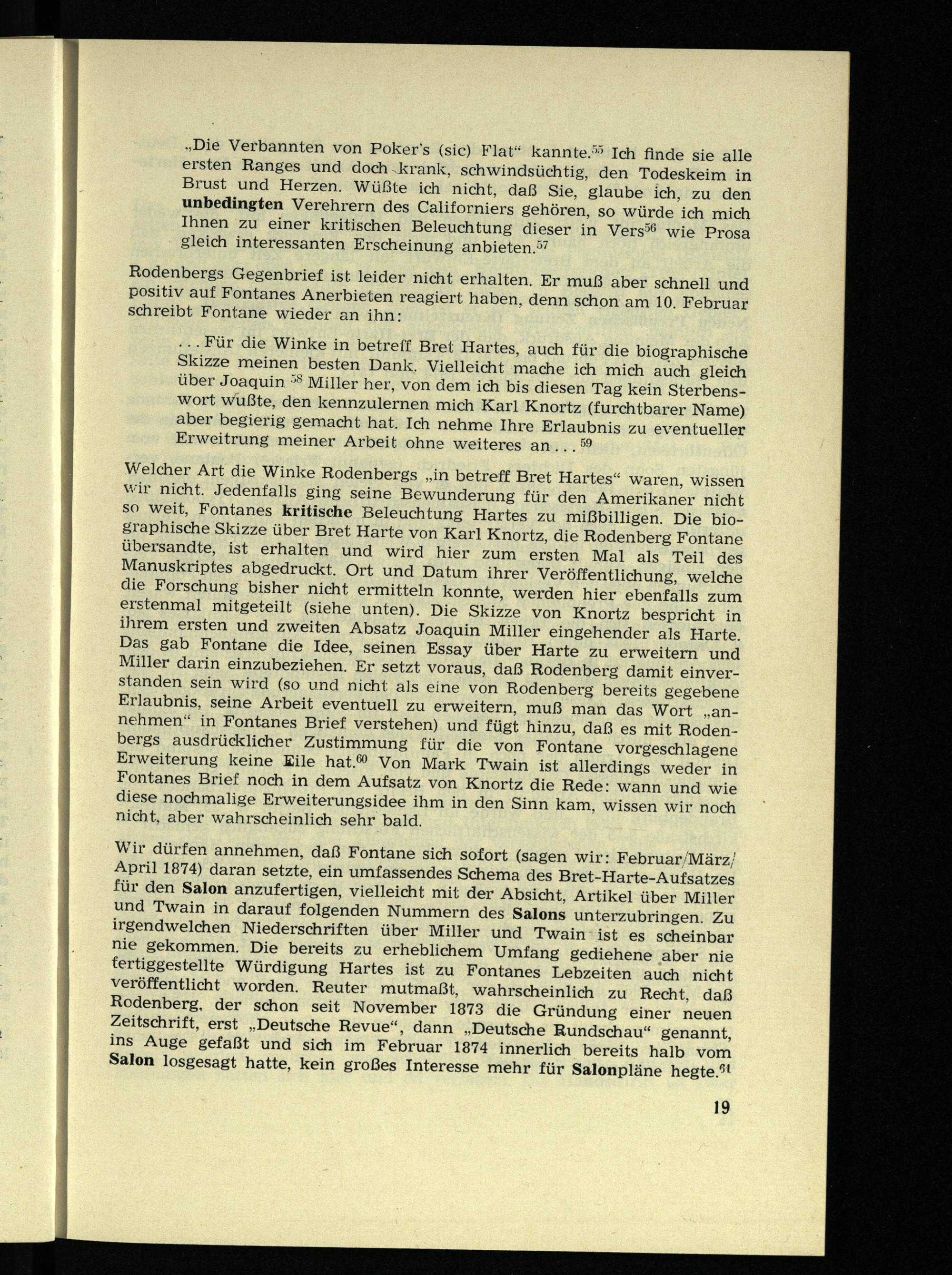 Wir dürfen annehmen, daß Fontane sich sofort (sagen wir: Februar/März/ April 1874) daran setzte, ein umfassendes Schema des Bret-Harte-Aufsatzes für den Salon anzufertigen, vielleicht mit der Absicht, Artikel über Miller und Twain in darauf folgenden Nummern des Salons unterzubringen. Zu irgendwelchen Niederschriften über Miller und Twain ist es scheinbar nie gekommen. Die bereits zu erheblichem Umfang gediehene aber nie fertiggestellte Würdigung Hartes ist zu Fontanes Lebzeiten auch nicht veröffentlicht worden. Reuter mutmaßt, wahrscheinlich zu Recht, daß Rodenberg, der schon seit November 1873 die Gründung einer neuen Zeitschrift, erst „Deutsche Revue“, dann „Deutsche Rundschau“ genannt, ins Auge gefaßt und sich im Februar 1874 innerlich bereits halb vom Salon losgesagt hatte, kein großes Interesse mehr für Salonpläne hegte. 61