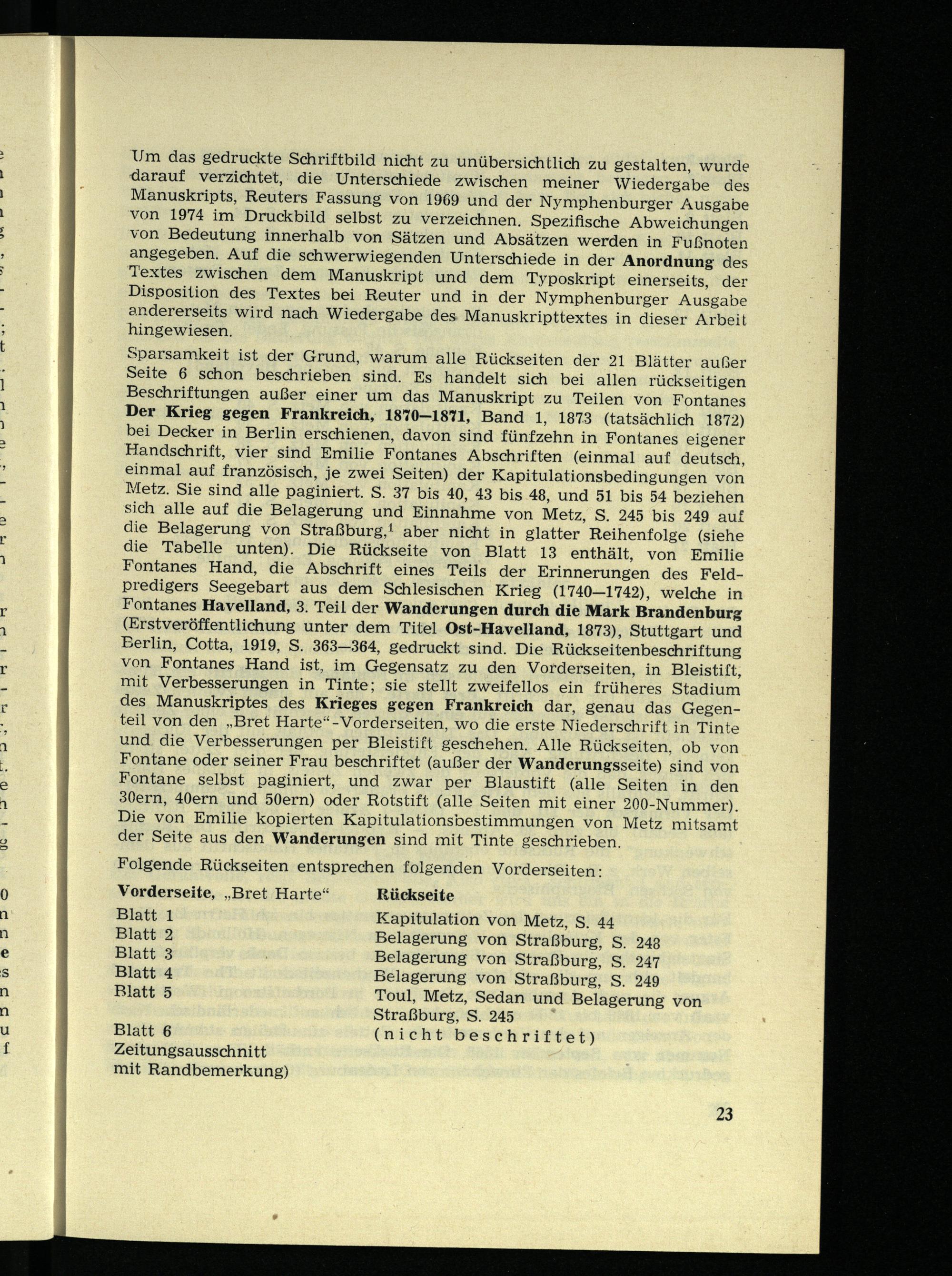 Sparsamkeit ist der Grund, warum alle Rückseiten der 21 Blätter außer Seite 6 schon beschrieben sind. Es handelt sich bei allen rückseitigen Beschriftungen außer einer um das Manuskript zu Teilen von Fontanes Der Krieg gegen Frankreich, 1870—1871, Band 1, 1873 (tatsächlich 1872) bei Decker in Berlin erschienen, davon sind fünfzehn in Fontanes eigener Handschrift, vier sind Emilie Fontanes Abschriften (einmal auf deutsch, einmal auf französisch, je zwei Seiten) der Kapitulationsbedingungen von Metz. Sie sind alle paginiert. S. 37 bis 40, 43 bis 48, und 51 bis 54 beziehen sich alle auf die Belagerung und Einnahme von Metz, S. 245 bis 249 auf die Belagerung von Straßburg, 1 aber nicht in glatter Reihenfolge (siehe die Tabelle unten). Die Rückseite von Blatt 13 enthält, von Emilie Fontanes Hand, die Abschrift eines Teils der Erinnerungen des Feldpredigers Seegebart aus dem Schlesischen Krieg (1740—1742), welche in Fontanes Havelland, 3. Teil der Wanderungen durch die Mark Brandenburg (Erstveröffentlichung unter dem Titel Ost-Havelland, 1873), Stuttgart und Berlin, Cotta, 1919, S. 363—364, gedruckt sind. Die Rückseitenbeschriftung von Fontanes Hand ist, im Gegensatz zu den Vorderseiten, in Bleistift, mit Verbesserungen in Tinte; sie stellt zweifellos ein früheres Stadium des Manuskriptes des Krieges gegen Frankreich dar, genau das Gegenteil von den „Bret Harte“-Vorderseiten, wo die erste Niederschrift in Tinte und die Verbesserungen per Bleistift geschehen. Alle Rückseiten, ob von Fontane oder seiner Frau beschriftet (außer der Wanderungsseite) sind von Fontane selbst paginiert, und zwar per Blaustift (alle Seiten in den 30ern, 40ern und 50ern) oder Rotstift (alle Seiten mit einer 200-Nummer). Die von Emilie kopierten Kapitulationsbestimmungen von Metz mitsamt der Seite aus den Wanderungen sind mit Tinte geschrieben.