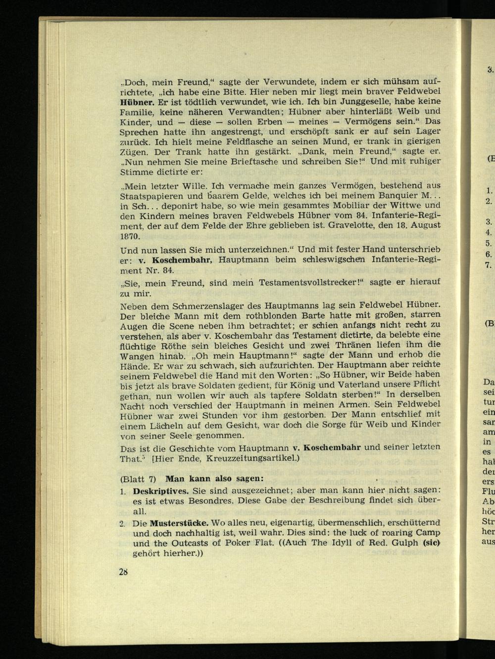 2. Die Musterstücke. Wo alles neu, eigenartig, übermenschlich, erschütternd und doch nachhaltig ist, weil wahr. Dies sind: the luck of roaring Camp und the Outcasts of Poker Flat. ((Auch The Idyll of Red. Gulph (sic) gehört hierher.))