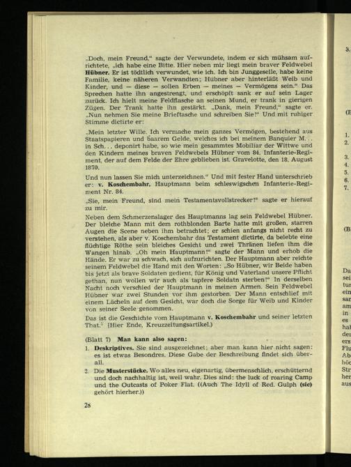 ..Mein letzter Wille. Ich vermache mein ganzes Vermögen, bestehend aus Staatspapieren und baarem Gelde, welches ich bei meinem Banquier M. .. in Sch.. . deponirt habe, so wie mein gesammtes Mobiliar der Wittwe und den Kindern meines braven Feldwebels Hübner vom 84. Infanterie-Regiment, der auf dem Felde der Ehre geblieben ist. Gravelotte, den 18. August 1870.