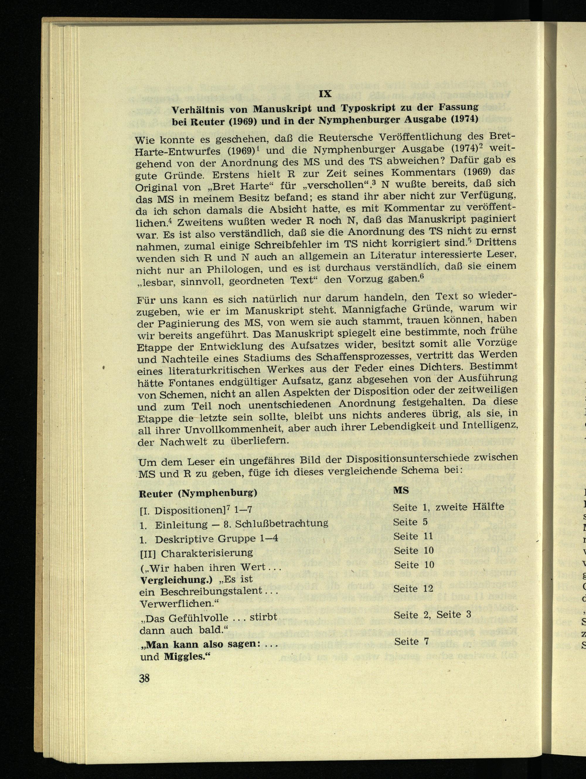 Wie konnte es geschehen, daß die Reutersche Veröffentlichung des Bret- Harte-Entwurfes (1969) 1 und die Nymphenburger Ausgabe (1974) 2 weitgehend von der Anordnung des MS und des TS abweichen? Dafür gab es gute Gründe. Erstens hielt R zur Zeit seines Kommentars (1969) das Original von „Bret Harte“ für „verschollen“. 3 N wußte bereits, daß sich das MS in meinem Besitz befand; es stand ihr aber nicht zur Verfügung, da ich schon damals die Absicht hatte, es mit Kommentar zu veröffentlichen. 4 Zweitens wußten weder R noch N, daß das Manuskript paginiert war. Es ist also verständlich, daß sie die Anordnung des TS nicht zu ernst nahmen, zumal einige Schreibfehler im TS nicht korrigiert sind. 5 Drittens wenden sich R und N auch an allgemein an Literatur interessierte Leser, nicht nur an Philologen, und es ist durchaus verständlich, daß sie einem „lesbar, sinnvoll, geordneten Text“ den Vorzug gaben. 6