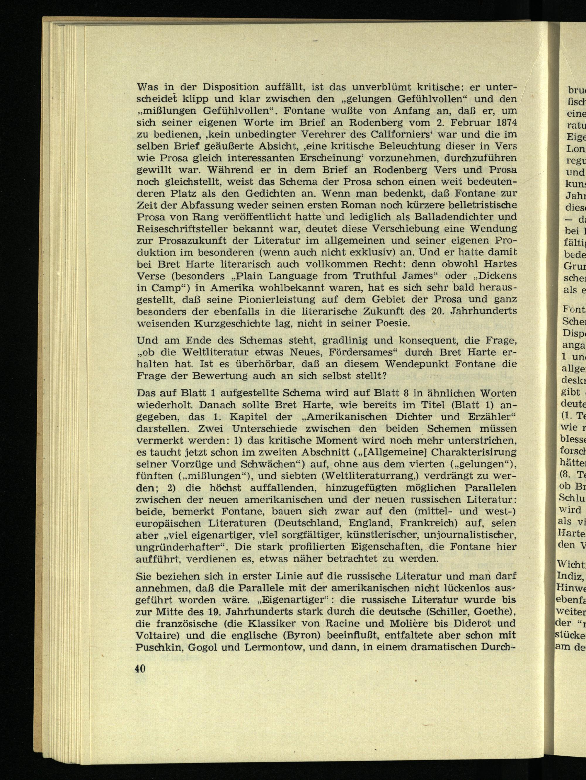 Was in der Disposition auffällt, ist das unverblümt kritische: er unterscheidet klipp und klar zwischen den „gelungen Gefühlvollen“ und den „mißlungen Gefühlvollen“. Fontane wußte von Anfang an, daß er, um sich seiner eigenen Worte im Brief an Rodenberg vom 2. Februar 1874 zu bedienen, ,kein unbedingter Verehrer des Californiers 1 war und die im selben Brief geäußerte Absicht, ,eine kritische Beleuchtung dieser in Vers wie Prosa gleich interessanten Erscheinung 1 vorzunehmen, durchzuführen gewillt war. Während er in dem Brief an Rodenberg Vers und Prosa noch gleichstellt, weist das Schema der Prosa schon einen weit bedeutenderen Platz als den Gedichten an. Wenn man bedenkt, daß Fontane zur Zeit der Abfassung weder seinen ersten Roman noch kürzere belletristische Prosa von Rang veröffentlicht hatte und lediglich als Balladendichter und Reiseschriftsteller bekannt war, deutet diese Verschiebung eine Wendung zur Prosazukunft der Literatur im allgemeinen und seiner eigenen Produktion im besonderen (wenn auch nicht exklusiv) an. Und er hatte damit bei Bret Harte literarisch auch vollkommen Recht: denn obwohl Hartes Verse (besonders „Plain Language from Truthful James“ oder „Dickens in Camp“) in Amerika wohlbekannt waren, hat es sich sehr bald herausgestellt, daß seine Pionierleistung auf dem Gebiet der Prosa und ganz besonders der ebenfalls in die literarische Zukunft des 20. Jahrhunderts weisenden Kurzgeschichte lag, nicht in seiner Poesie.