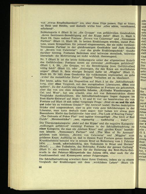 Der letzte, achte Teil der Disposition auf Blatt 5 ist die „Schlußbetrach- tung, aber ohne Vergleich mit den europäischen Literaturen. (Dies erst später)“. Zu der Ausführung dieses Vergleiches ist Fontane nie gekommen, aber das von uns oben mitgeteilte Schema, „Kritische Wanderungen in Ost und West“, hat uns erlaubt, eine Art von Rekonstruktion dieser Vergleiche durchzuführen. Die Schlußbetrachtungen liegen dagegen im Eret-Harte-Entwurf auf Blatt 7, 13 und 21 vor: sie beantworten die von Fontane auf Blatt 10 sich selbst vorgelegte Frage: „Sind sie an und für sich gut (oder bis zu welchem Grade)?“ Die Antwort lautet: Hartes deskriptive Stücke sind ausgezeichnet, aber es gibt viele gute Schilderungen in der Literatur, man kann deshalb nicht sagen: hier haben wir etwas ganz Besonderes. Bleibt das Gefühlvolle: hier sind „The Luck of Roaring Camp“. „The Outcasts of Poker Flat“ und (später hinzugefügt) „The Idyll of Red Gulch“ „Meisterstücke“: „neu, eigenartig ... nachhaltig ... wahr“.