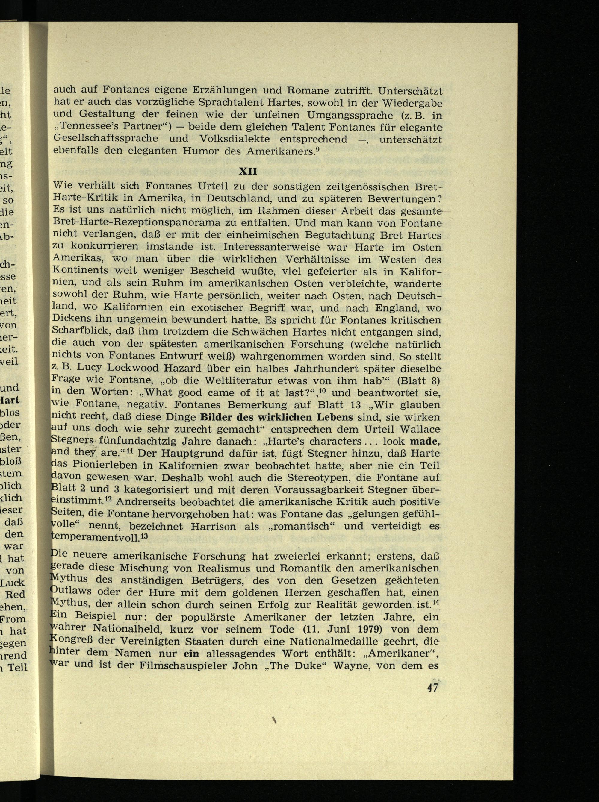 Wie verhält sich Fontanes Urteil zu der sonstigen zeitgenössischen Bret- Harte-Kritik in Amerika, in Deutschland, und zu späteren Bewertungen? Es ist uns natürlich nicht möglich, im Rahmen dieser Arbeit das gesamte Bret-Harte-Rezeptionspanorama zu entfalten. Und man kann von Fontane nicht verlangen, daß er mit der einheimischen Begutachtung Bret Hartes zu konkurrieren imstande ist. Interessanterweise war Harte im Osten Amerikas, wo man über die wirklichen Verhältnisse im Westen des Kontinents weit weniger Bescheid wußte, viel gefeierter als in Kalifornien, und als sein Ruhm im amerikanischen Osten verbleichte, wanderte sowohl der Ruhm, wie Harte persönlich, weiter nach Osten, nach Deutschland, wo Kalifornien ein exotischer Begriff war, und nach England, wo Dickens ihn ungemein bewundert hatte. Es spricht für Fontanes kritischen Scharfblick, daß ihm trotzdem die Schwächen Hartes nicht entgangen sind, die auch von der spätesten amerikanischen Forschung (welche natürlich nichts von Fontanes Entwurf weiß) wahrgenommen worden sind. So stellt z. B. Lucy Lockwood Hazard über ein halbes Jahrhundert später dieselbe Frage wie Fontane, „ob die Weltliteratur etwas von ihm hab’“ (Blatt 3) in den Worten: „What good came of it at last?“, 10 und beantwortet sie, wie Fontane, negativ. Fontanes Bemerkung auf Blatt 13 „Wir glauben nicht recht, daß diese Dinge Bilder des wirklichen Lebens sind, sie wirken uf uns doch wie sehr zurecht gemacht“ entsprechen dem Urteil Wallace -tegners fünfundachtzig Jahre danach: „Harte’s characters ... look made, nd they are.“ 11 Der Hauptgrund dafür ist, fügt Stegner hinzu, daß Harte as Pionierleben in Kalifornien zwar beobachtet hatte, aber nie ein Teil avon gewesen war. Deshalb wohl auch die Stereotypen, die Fontane auf latt 2 und 3 kategorisiert und mit deren Voraussagbarkeit Stegner über- instimmt. 12 Andrerseits beobachtet die amerikanische Kritik auch positive eiten, die Fontane hervorgehoben hat: was Fontane das „gelungen gefühl- olle“ nennt, bezeichnet Harrison als „romantisch“ und verteidigt es emperamentvoll. 13