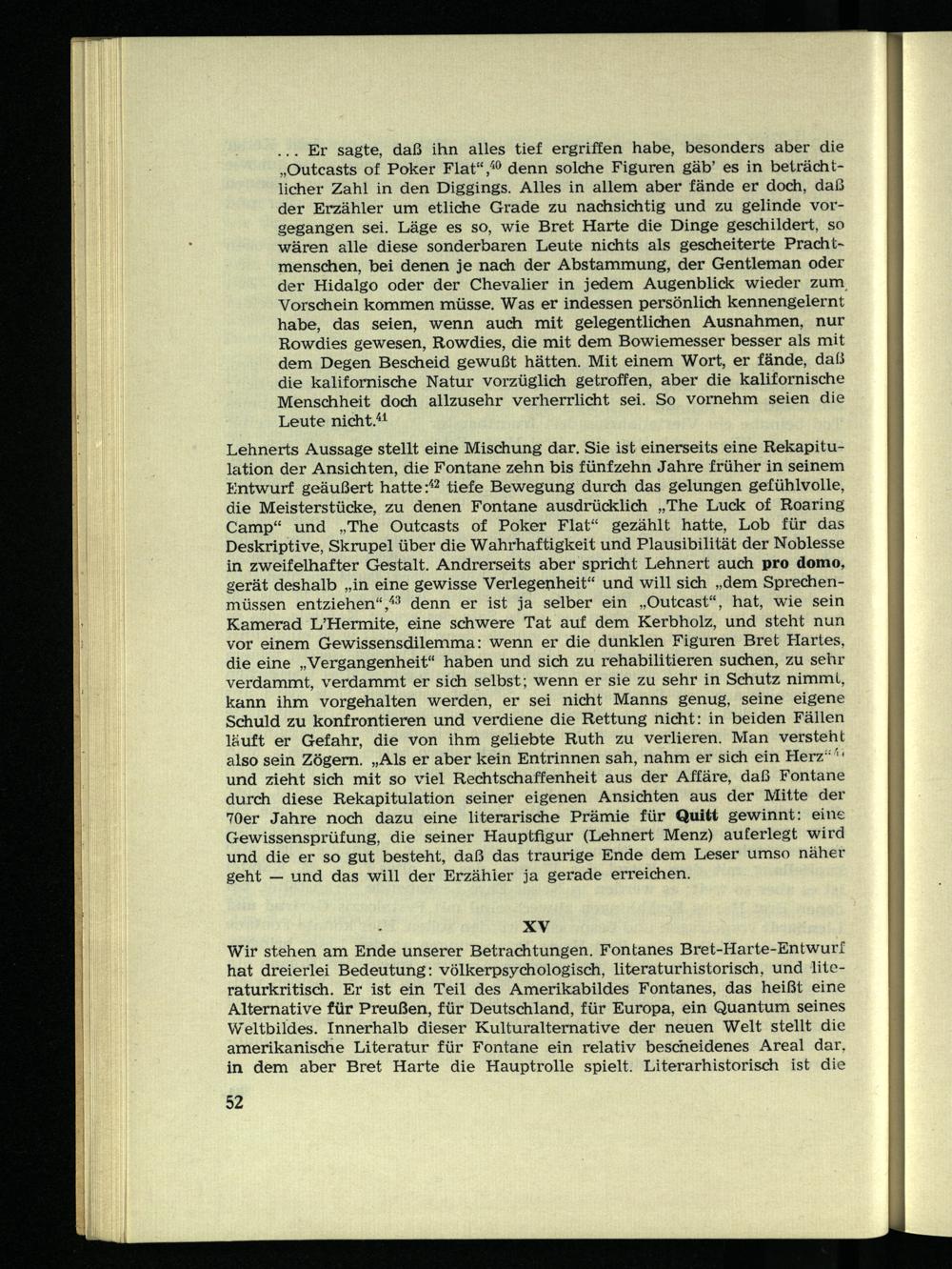 Lehnerts Aussage stellt eine Mischung dar. Sie ist einerseits eine Rekapitulation der Ansichten, die Fontane zehn bis fünfzehn Jahre früher in seinem Entwurf geäußert hatte: 42 tiefe Bewegung durch das gelungen gefühlvolle, die Meisterstücke, zu denen Fontane ausdrücklich „The Luck of Roaring Camp“ und „The Outcasts of Poker Flat“ gezählt hatte, Lob für das Deskriptive, Skrupel über die Wahrhaftigkeit und Plausibilität der Noblesse in zweifelhafter Gestalt. Andrerseits aber spricht Lehnert auch pro domo, gerät deshalb „in eine gewisse Verlegenheit“ und will sich „dem Sprechenmüssen entziehen“, 43 denn er ist ja selber ein „Outcast“, hat, wie sein Kamerad L’Hermite, eine schwere Tat auf dem Kerbholz, und steht nun vor einem Gewissensdilemma: wenn er die dunklen Figuren Bret Hartes, die eine „Vergangenheit“ haben und sich zu rehabilitieren suchen, zu sehr verdammt, verdammt er sich selbst; wenn er sie zu sehr in Schutz nimmt, kann ihm vorgehalten werden, er sei nicht Manns genug, seine eigene Schuld zu konfrontieren und verdiene die Rettung nicht: in beiden Fällen läuft er Gefahr, die von ihm geliebte Ruth zu verlieren. Man versteht also sein Zögern. „Als er aber kein Entrinnen sah, nahm er sich ein Herz“ 1 ' und zieht sich mit so viel Rechtschaffenheit aus der Affäre, daß Fontane durch diese Rekapitulation seiner eigenen Ansichten aus der Mitte der 70er Jahre noch dazu eine literarische Prämie für Quitt gewinnt: eine Gewissensprüfung, die seiner Hauptfigur (Lehnert Menz) au [erlegt wird und die er so gut besteht, daß das traurige Ende dem Leser umso näher geht — und das will der Erzähler ja gerade erreichen.