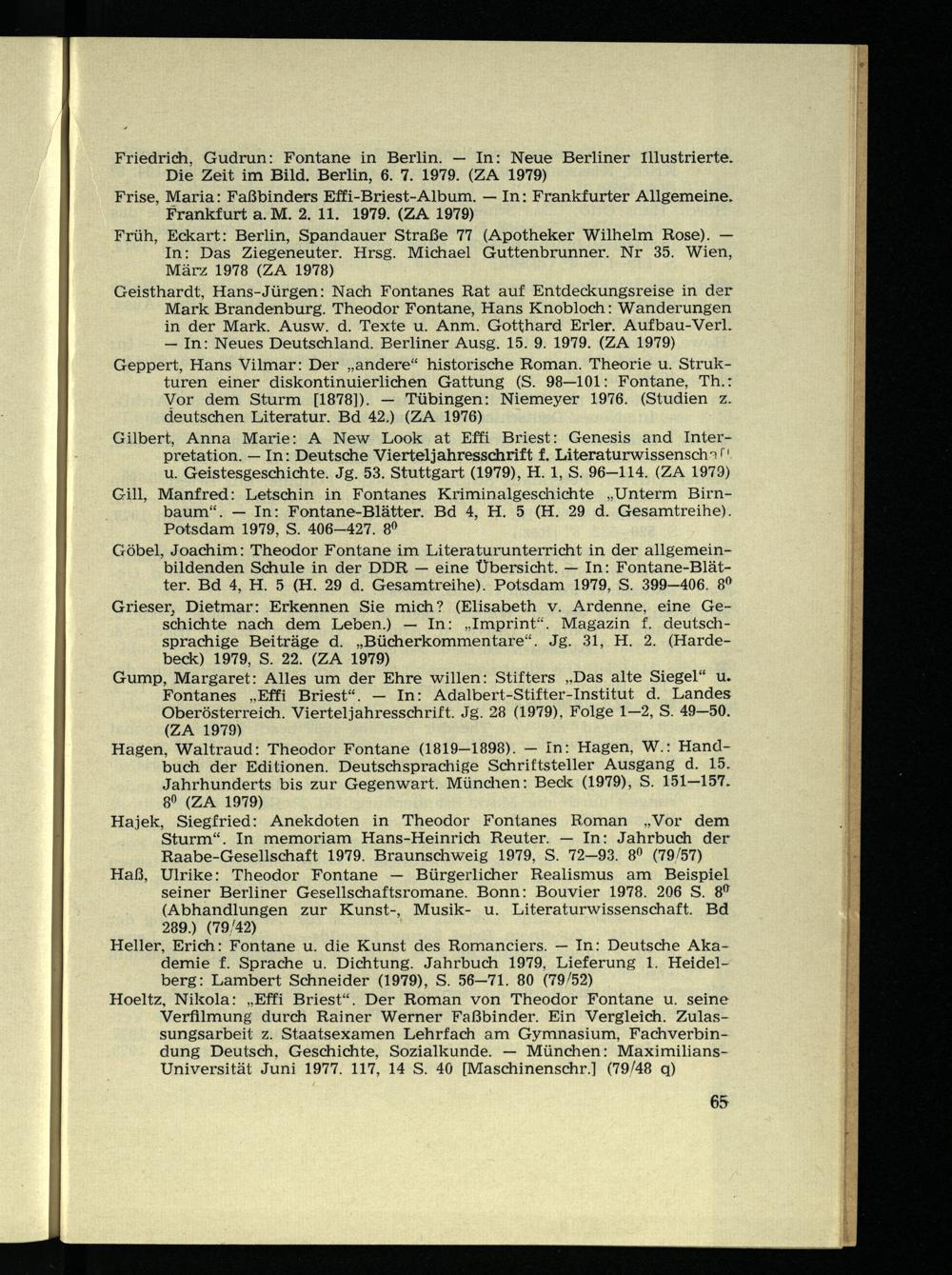 Gilbert, Anna Marie: A New Look at Effi Briest: Genesis and Interpretation. — In: Deutsche Vierteljahresschrift f. Literaturwissenschi P u. Geistesgeschichte. Jg. 53. Stuttgart (1979), H. 1, S. 96—114. (ZA 1979) Gill, Manfred: Letschin in Fontanes Kriminalgeschichte „Unterm Birnbaum“. — In: Fontane-Blätter. Bd 4, H. 5 (H. 29 d. Gesamtreihe). Potsdam 1979, S. 406-427. 8°