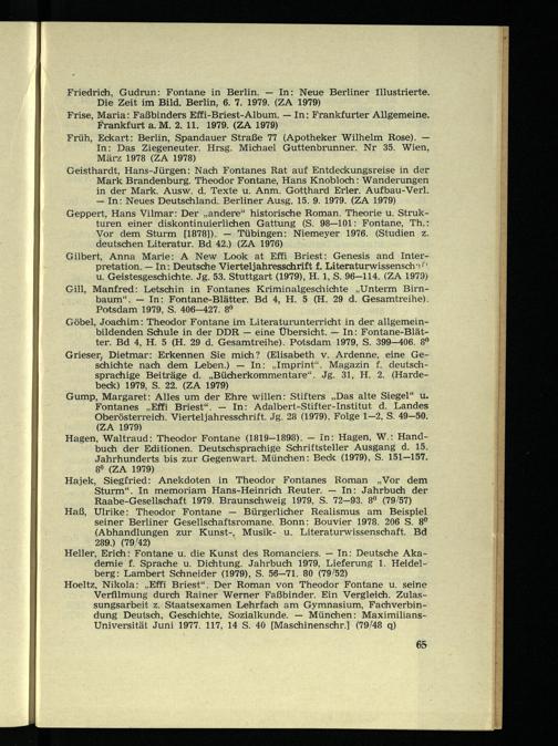 Hoeltz, Nikola: „Effi Briest“. Der Roman von Theodor Fontane u. seine Verfilmung durch Rainer Werner Faßbinder. Ein Vergleich. Zulassungsarbeit z. Staatsexamen Lehrfach am Gymnasium, Fachverbindung Deutsch, Geschichte, Sozialkunde. — München: Maximilians- Universität Juni 1977. 117, 14 S. 40 [Maschinenschr.] (79/48 q)