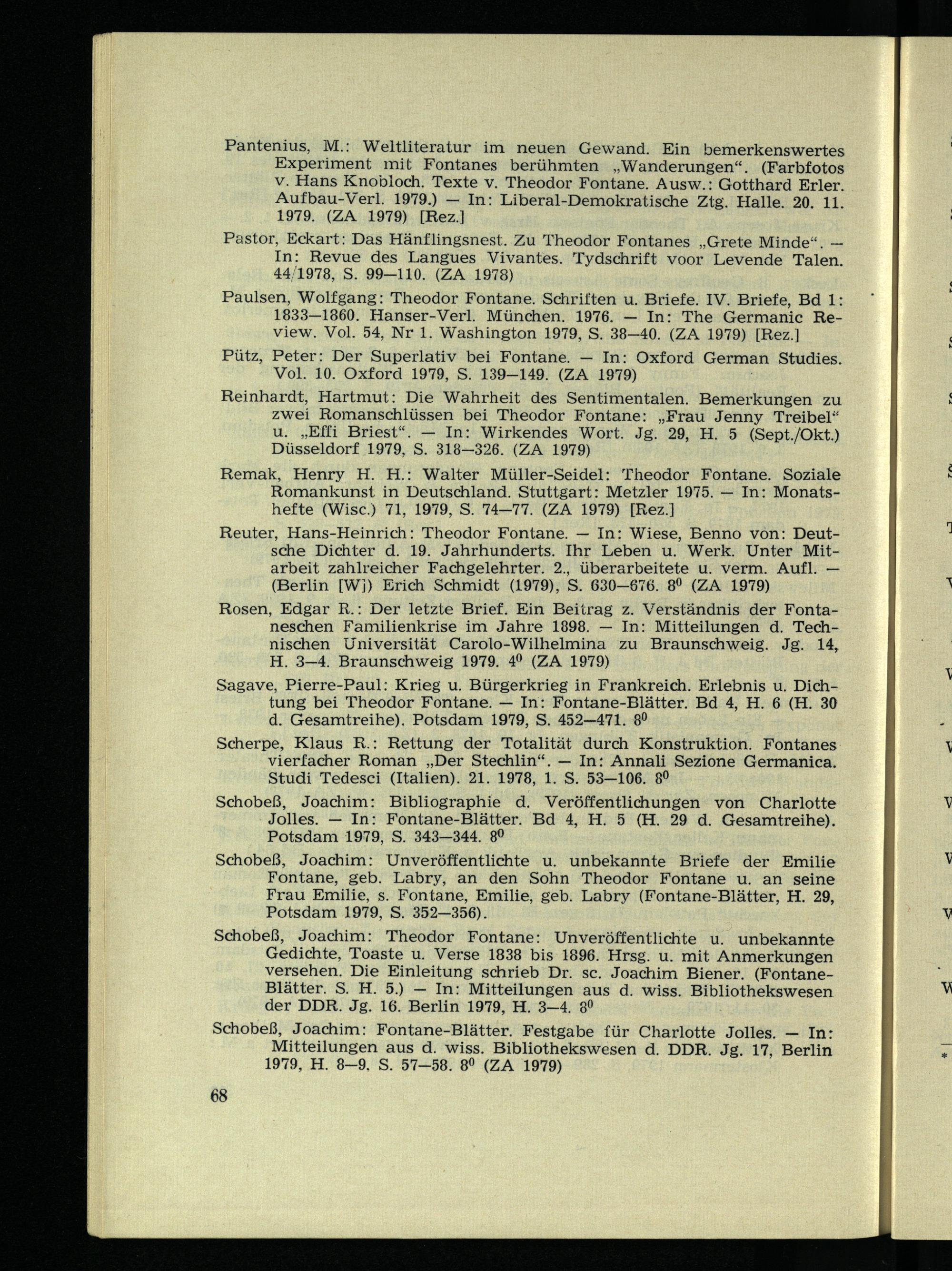 Schobeß, Joachim: Fontane-Blätter. Festgabe für Charlotte Jolles. — In: Mitteilungen aus d. wiss. Bibliothekswesen d. DDR. Jg. 17, Berlin 1979, H. 8-9. S. 57-58. 8° (ZA 1979)