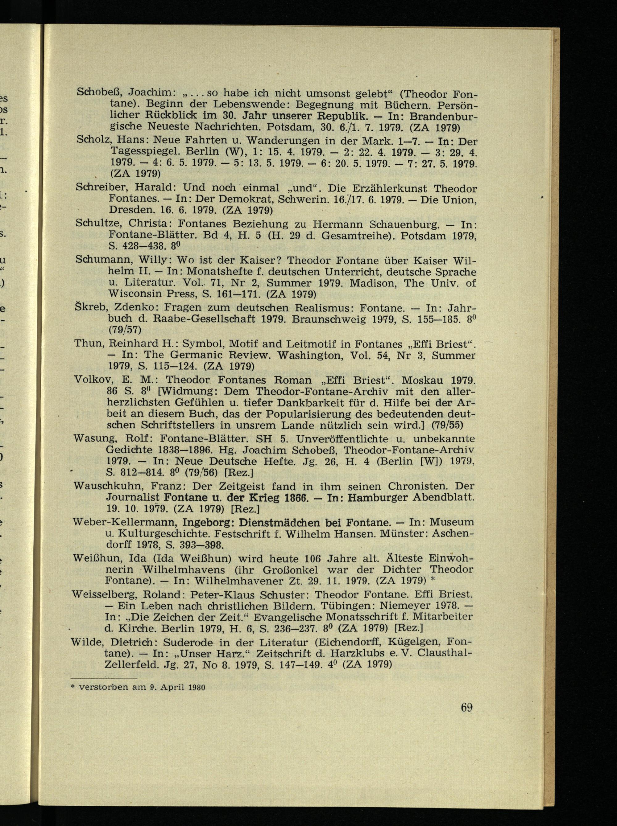 Schobeß, Joachim: „ so habe ich nicht umsonst gelebt“ (Theodor Fontane). Beginn der Lebenswende: Begegnung mit Büchern. Persönlicher Rückblick im 30. Jahr unserer Republik. — In: Brandenbur- gische Neueste Nachrichten. Potsdam, 30. 6./1. 7. 1979. (ZA 1979)