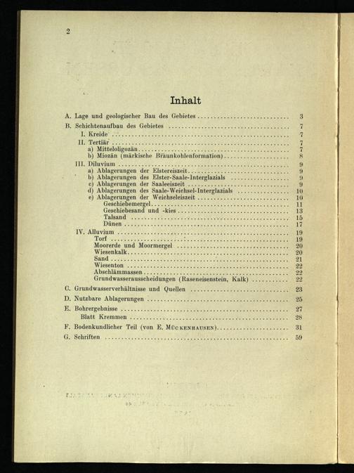 B. Schichtenaufbau des Gebietes I. Kreide: IL. Tertiär a) Mitteloligozän b) Miozän(märkische Braäunkohlentormation) IIT. Diluvium a) Ablagerungen b) Ablagerungen des Elster-Saale-Interglazials c) Ablagerungen der Saaleeiszeit d) Ablagerungen des Saale-Weichsel-Interglazials e) Ablagerungen der Weichseleiszeit Geschiebemergel Geschiebesand und-kies Talsand