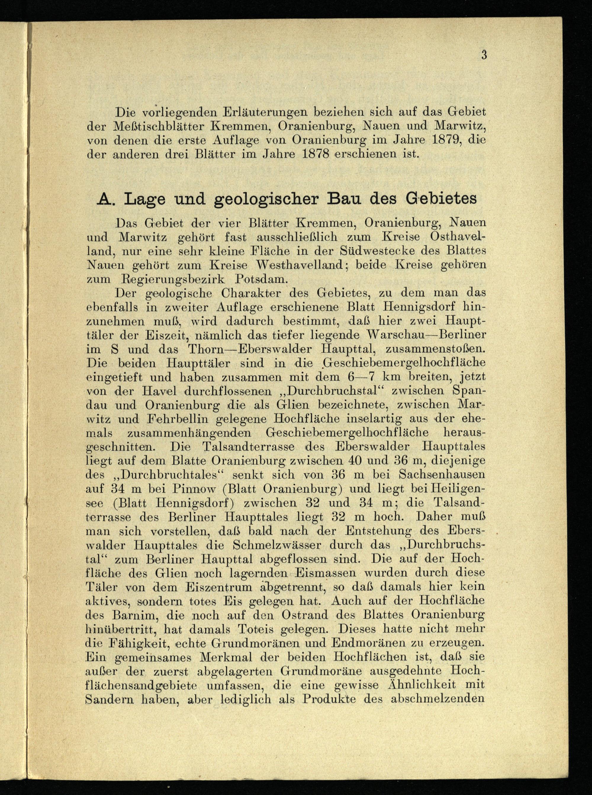 Die vorliegenden Erläuterungen beziehen sich auf das Gebiet der Meßtischblätter Kremmen, Oranienburg, Nauen und Marwitz, von denen die erste Auflage von Oranienburg im Jahre 1879, die der anderen drei Blätter im Jahre 1878 erschienen ist.