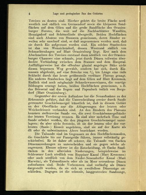 Toteises zu deuten sind. Hierher gehört die breite Fläche nordwestlich und südlich von Germendorf sowie die kleineren Sandflächen auf dem Glien und die große Sandfläche des Oranienburger Forstes, die weit auf die Nachbarblätter Wandlitz, Hennigsdorf und Schönerlinde übergreift. Beiden Hochflächen sind auch Absätze von Stauseen gemeinsam, deren Ränder zuweilen sehr unscharf sind, so daß angenommen werden muß, daß sie durch Eis aufgestaut worden sind. Kin solches Staubecken ist das von Wensickendorf, dessen Westrand südlich von Schmachtenhagen auf Blatt Oranienburg liegt. Erst nach dem Abschmelzen des"Toteises entstand dann nördlich von der Oranienburger Chaussee eine schmale, jetzt durch Dünen teilweise überdeckte Verbindung zwischen dem Stausee und dem.Haupttal. Auffälligerweise hat die offenbar glazial angelegte Bäke nicht diesen. bequemen Weg gewählt, sondern hat sich, durch MHismassen abgelenkt, auf eine Strecke von 1/, km Länge eine tiefe Schlucht durch das heute größtenteils verdünte Plateau genagt. Kin anderes Staubecken liegt auf dem Glien auf Blatt Kremmen. Endlich sind noch subglaziale Schmelzwasserrinnen, die osartige Bildungen erzeugt haben, beiden Hochflächen gemeinsam, z.B. das Briesetal und das Bogen- und Papenluch östlich von Borgsdorf(Blatt Oranienburg).