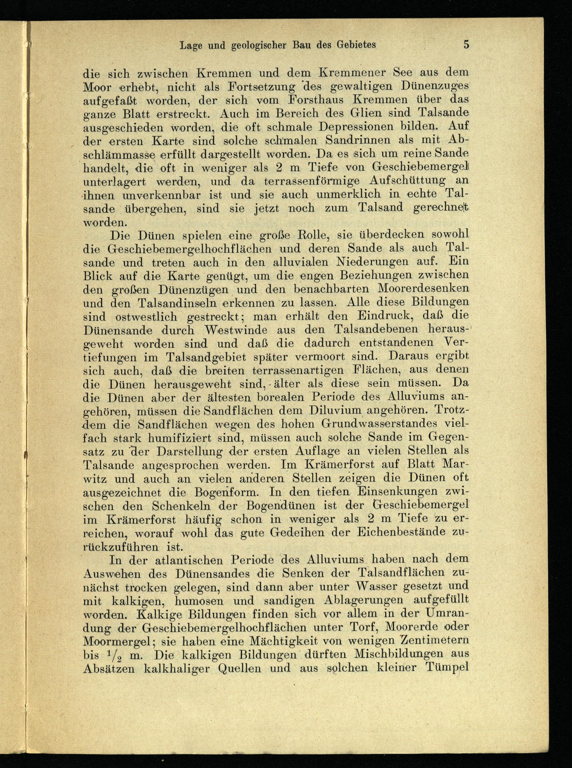 Die Dünen spielen eine große Rolle, sie überdecken sowohl die Geschiebemergelhochflächen und deren Sande als auch Talsande und treten auch in den alluvialen Niederungen auf. Ein Blick auf die Karte genügt, um die engen Beziehungen zwischen den großen Dünenzügen und den benachbarten Moorerdesenken und den Talsandinseln erkennen zu lassen. Alle diese Bildungen sind ostwestlich gestreckt; man erhält den Eindruck, daß die Dünensande durch Westwinde aus den Talsandebenen herausgeweht worden sind und daß die dadurch entstandenen Vertiefungen im Talsandgebiet später vermoort sind. Daraus ergibt sich auch, daß die breiten terrassenartigen Flächen, aus denen die Dünen herausgeweht sind,-älter als diese sein müssen. Da die Dünen aber der ältesten borealen Periode des Alluviums angehören, müssen die Sandflächen dem Diluvium angehören."U’rotzdem die Sandflächen wegen des hohen Grundwasserstandes vielfach stark humifiziert sind, müssen auch solche Sande im Gegensatz zu der Darstellung der ersten Auflage an vielen Stellen als Talsande angesprochen werden. Im Krämerforst auf Blatt Marwitz und auch an vielen anderen Stellen zeigen die Dünen oft ausgezeichnet die. Bogenform. In den tiefen Einsenkungen zwischen den: Schenkeln der Bogendünen ist der Geschiebemergel im Krämerforst häufig schon in weniger als 2 m Tiefe zu erreichen, worauf wohl das gute Gedeihen der Eichenbestände zurückzuführen ist. | In der atlantischen Periode des Alluviums. haben nach dem Auswehen des Dünensandes die Senken der Talsandflächen zunächst trocken gelegen, sind dann aber unter Wasser gesetzt und mit kalkigen, humosen und sandigen Ablagerungen aufgefüllt worden. Kalkige Bildungen finden sich vor allem in der Umrandung der Geschiebemergelhochflächen unter Torf, Moorerde oder Moormergel; sie haben eine Mächtigkeit von wenigen Zentimetern bis 1/2 m. Die kalkigen Bildungen dürften Mischbildungen aus Absätzen kalkhaliger Quellen und aus solchen kleiner Tümpel