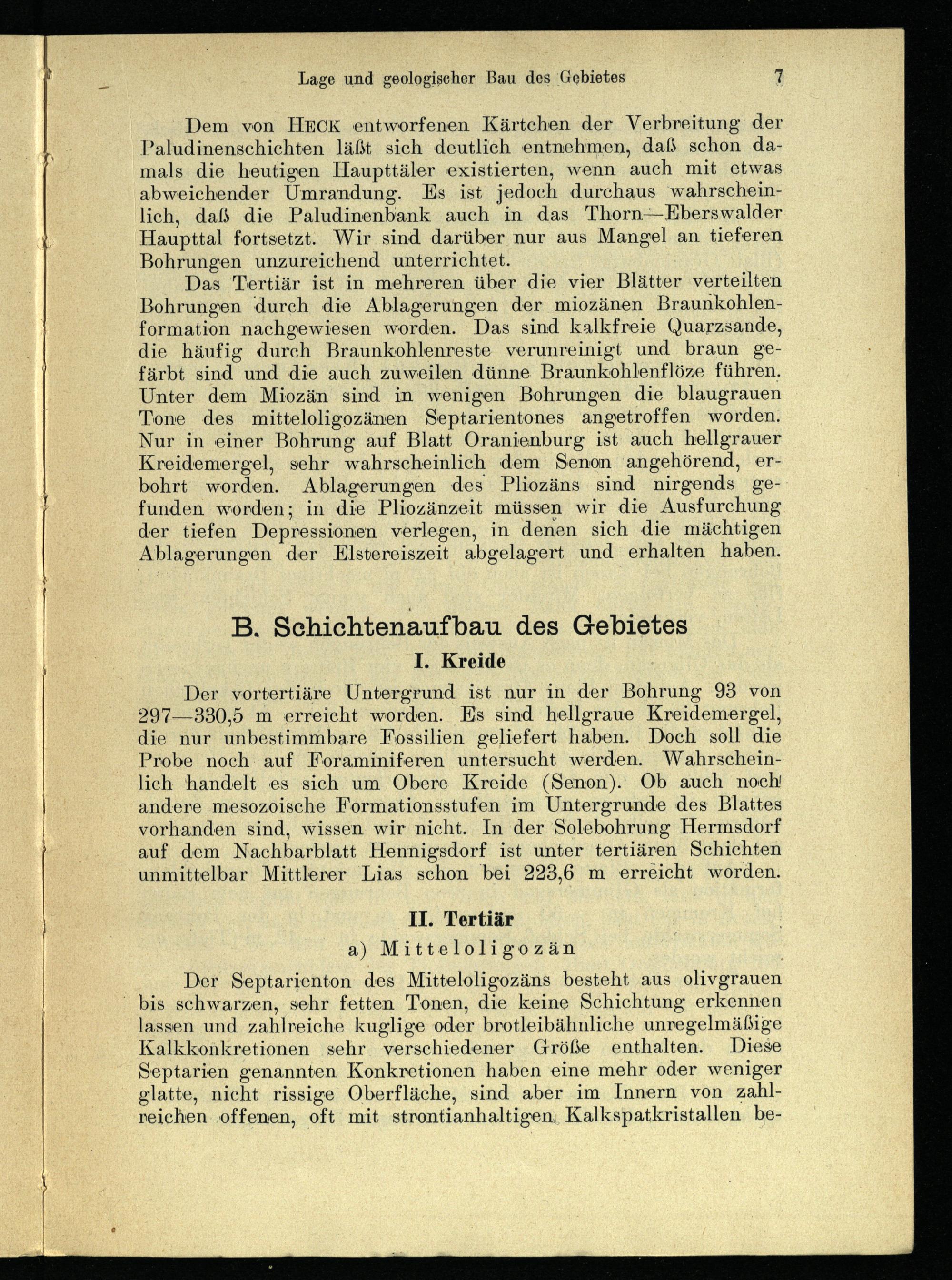 Dem von HECK entworfenen Kärtchen der Verbreitung der Paludinenschichten läßt sich deutlich entnehmen, daß schon damals die heutigen Haupttäler existierten, wenn auch mit etwas abweichender Umrandung. Es ist jedoch durchaus wahrscheinlich, daß die Paludinenbank auch in das Thorn—HEberswalder Haupttal fortsetzt. Wir sind darüber nur aus Mangel an tieferen Bohrungen unzureichend unterrichtet.