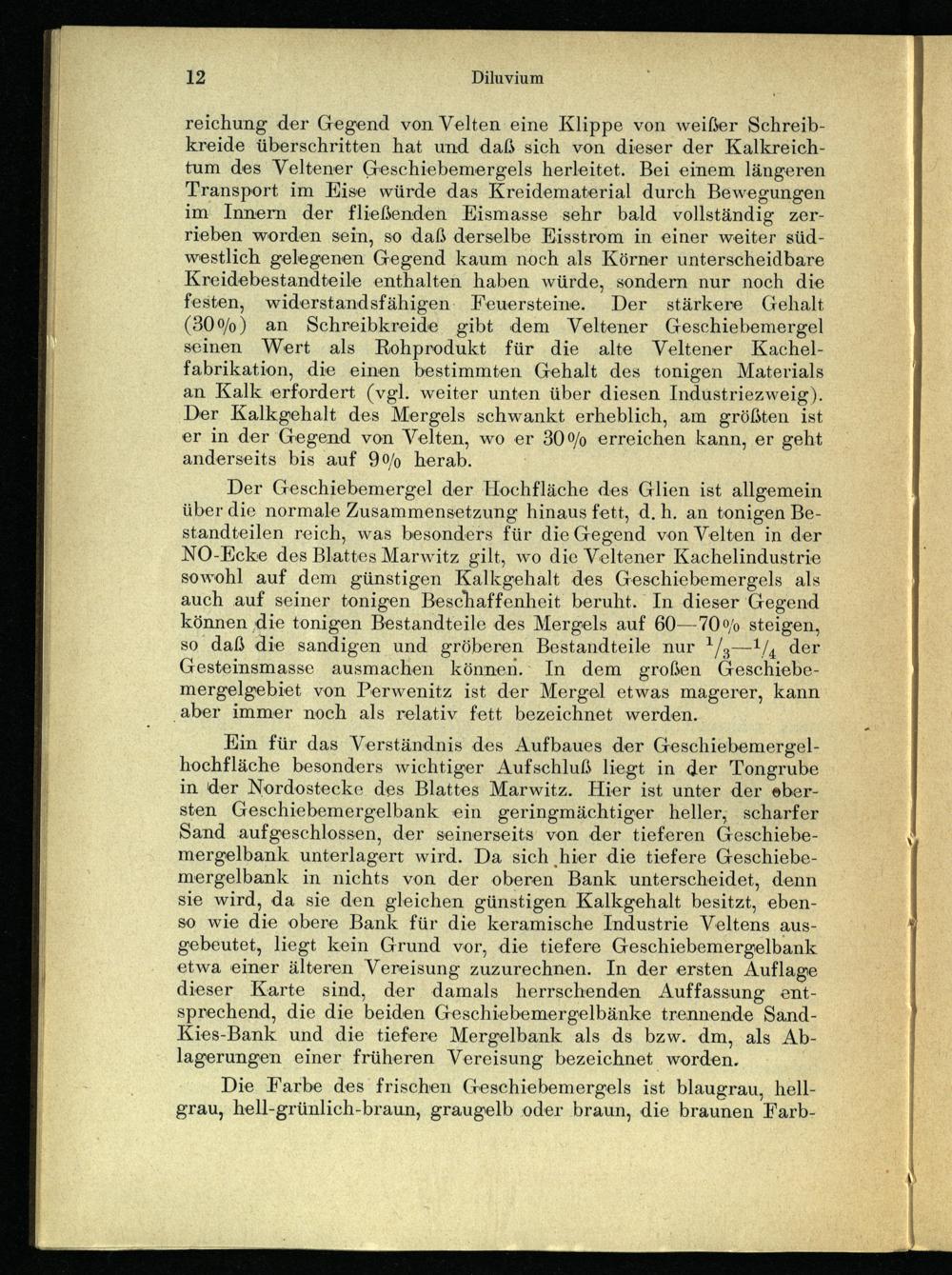 reichung der Gegend von Velten eine Klippe von weißer Schreibkreide überschritten hat und daß sich von dieser der Kalkreichtum des Veltener Geschiebemergels herleitet. Bei einem längeren Transport im KEise würde das Kreidematerial durch Bewegungen im Innern der fließenden Eismasse sehr bald vollständig zerrieben worden sein, so daß derselbe Eisstrom in einer weiter südwestlich gelegenen Gegend kaum noch als Körner unterscheidbare Kreidebestandteile enthalten haben würde, sondern nur noch die festen, widerstandsfähigen. Feuersteine. Der stärkere Gehalt (30%) an Schreibkreide gibt dem Veltener Geschiebemergel seinen Wert als Rohprodukt für die alte Veltener Kachelfabrikation, die einen bestimmten Gehalt des tonigen Materials an Kalk erfordert(vgl. weiter unten über diesen Industriezweig). Der Kalkgehalt des Mergels schwankt erheblich, am größten ist er in der Gegend von Velten, wo er 30% erreichen kann, er geht anderseits bis auf 9% herab.
