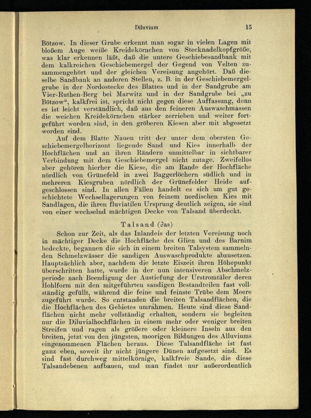 Auf dem Blatte Nauen tritt der unter dem obersten Geschiebemergelhorizont liegende Sand und Kies innerhalb der Hochflächen und an ihren Rändern unmittelbar in sichtbarer Verbindung mit dem Geschiebemergel nicht zutage. Zweifellos aber gehören hierher die Kiese, die am Rande der Hochfläche nördlich von Grünefeld in zwei Baggerlöchern südlich und. in mehreren Kiesgruben nördlich der Grünefelder Heide aufgeschlossen. sind. In allen Fällen handelt es sich um gut geschichtete Wechsellagerungen von feinem nordischen Kies mit Sandlagen, die ihren fluviatilen Ursprung deutlich zeigen, sie sind von einer wechselnd mächtigen Decke von Talsand überdeckt.