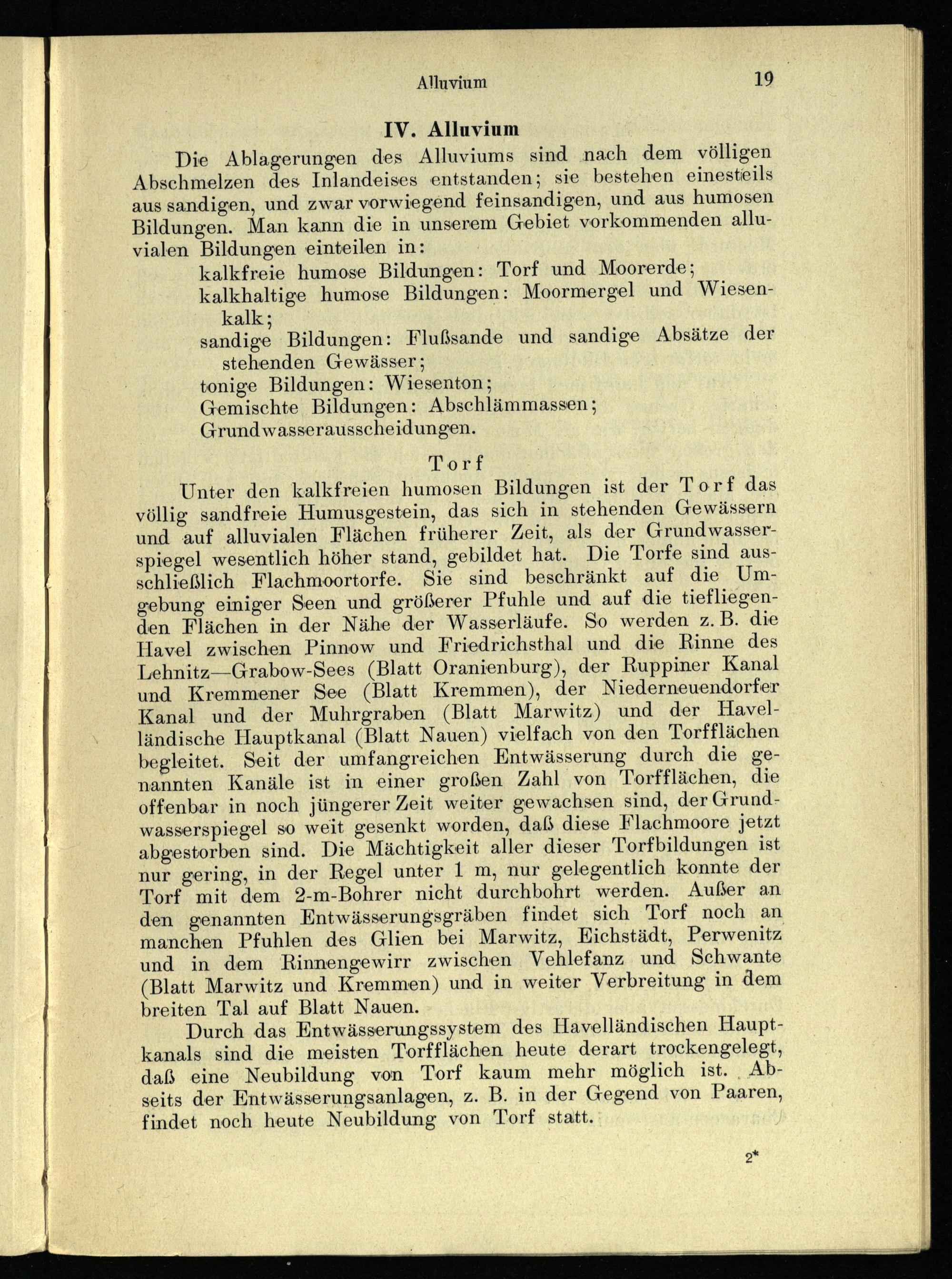 Unter den kalkfreien humosen Bildungen ist der Torf das völlig sandfreie Humusgestein, das sich in stehenden Gewässern und auf alluvialen Flächen früherer Zeit, als der Grundwasserspiegel wesentlich höher stand, gebildet hat. Die Torfe sind ausschließlich Flachmoortorfe. Sie sind beschränkt auf die Umgebung einiger Seen und größerer Pfuhle und auf die tiefliegenden Flächen in der Nähe der Wasserläufe. So werden z.B. die Havel zwischen Pinnow und Friedrichsthal und die Rinne des Lehnitz—Grabow-Sees(Blatt Oranienburg), der Ruppiner Kanal und Kremmener See(Blatt Kremmen), der Niederneuendorfer Kanal und der Muhrgraben(Blatt Marwitz) und der Havelländische Hauptkanal(Blatt Nauen) vielfach von den Torfflächen begleitet. Seit der umfangreichen Entwässerung durch die genannten Kanäle ist in einer großen Zahl von Torfflächen, die offenbar in noch jüngerer Zeit weiter gewachsen sind, der Grundwasserspiegel so weit gesenkt worden, daß diese Flachmoore jetzt abgestorben sind. Die Mächtigkeit aller dieser Torfbildungen ist nur gering, in der Regel unter 1 m, nur gelegentlich konnte der Torf mit dem 2-m-Bohrer nicht durchbohrt werden. Außer an den genannten Entwässerungsgräben findet sich Torf noch an manchen Pfuhlen des Glien bei Marwitz, Eichstädt, Perwenitz und in dem Rinnengewirr zwischen Vehlefanz und Schwante (Blatt Marwitz und Kremmen) und in weiter Verbreitung in dem breiten Tal auf Blatt Nauen.