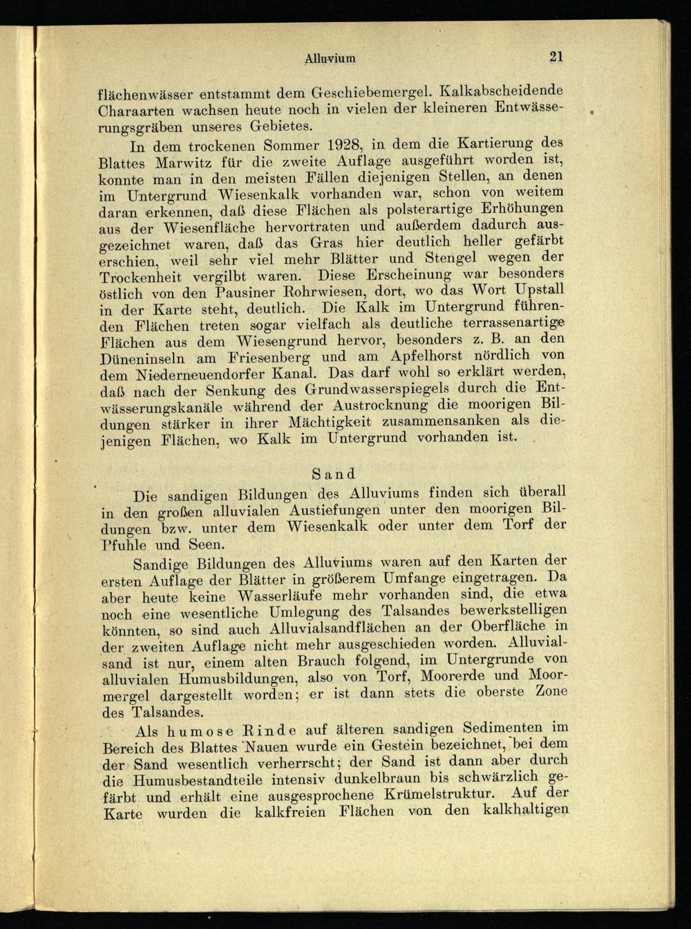 In dem trockenen Sommer 1928, in dem die Kartierung des Blattes Marwitz für die zweite Auflage ausgeführt worden ist, konnte man in den meisten Fällen diejenigen Stellen, an denen im Untergrund Wiesenkalk vorhanden war, schon von weitem daran ‚erkennen, daß diese Flächen als polsterartige Erhöhungen aus der Wiesenfläche hervortraten und außerdem dadurch ausgezeichnet waren, daß das Gras hier deutlich heller gefärbt erschien, weil sehr viel mehr Blätter und Stengel wegen der Trockenheit vergilbt waren. Diese Erscheinung war besonders östlich von den Pausiner Rohrwiesen, dort, wo das Wort Upstall in der Karte steht, deutlich. Die Kalk im Untergrund führenden Flächen treten sogar vielfach als deutliche terrassenartige Flächen aus dem Wiesengrund hervor, besonders z. B. an den Düneninseln am Friesenberg und am Apfelhorst nördlich von dem Niederneuendorfer Kanal. Das darf wohl so erklärt werden, daß nach der Senkung des Grundwasserspiegels durch die Entwässerungskanäle während der Austrocknung die moorigen Bildungen stärker in ihrer Mächtigkeit zusammensanken als diejenigen Flächen, wo Kalk im Untergrund vorhanden ist.
