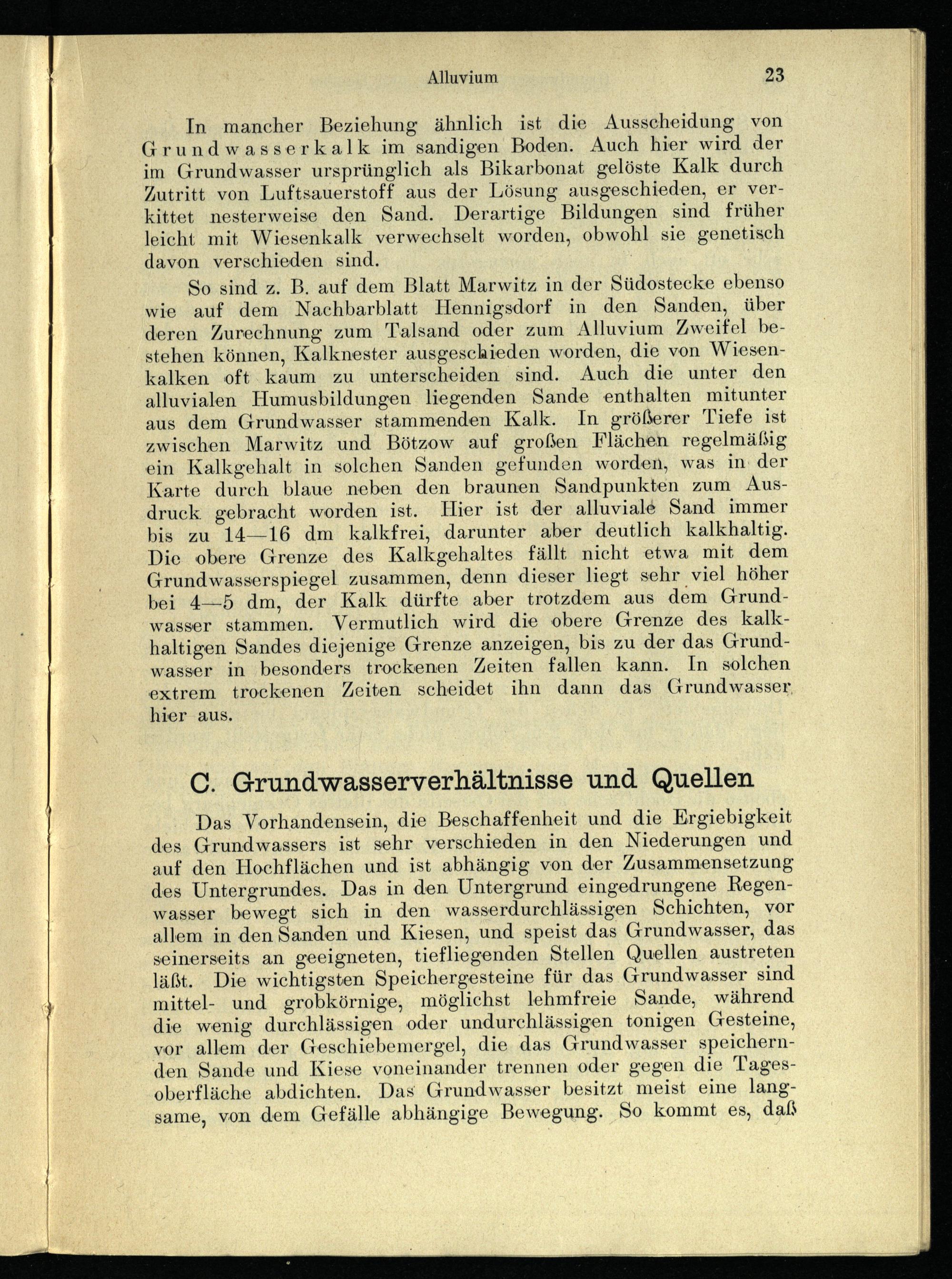So sind z. B. auf dem Blatt Marwitz in der Südostecke ebenso wie auf dem Nachbarblatt Hennigsdorf in den Sanden, über deren Zurechnung zum Talsand oder zum Alluvium Zweifel bestehen können, Kalknester ausgeschieden worden, die von Wiesenkalken oft kaum zu unterscheiden sind. Auch die unter den alluvialen Humusbildungen liegenden Sande enthalten mitunter aus dem Grundwasser stammenden Kalk. In größerer Tiefe ist zwischen Marwitz und Bötzow auf großen Flächen regelmäßig ein Kalkgehalt in solchen Sanden gefunden worden, was in: der Karte durch blaue neben den braunen Sandpunkten zum Ausdruck. gebracht worden ist. Hier ist der alluviale Sand immer bis zu 14—16 dm kalkfrei, darunter aber deutlich kalkhaltig. Die obere Grenze des Kalkgehaltes fällt nicht etwa mit dem Grundwasserspiegel zusammen, denn dieser liegt sehr viel höher bei 4—5 dm, der Kalk dürfte aber trotzdem aus dem Grundwasser stammen. Vermutlich wird die obere Grenze des kalkhaltigen Sandes diejenige Grenze anzeigen, bis zu der das Grundwasser in besonders trockenen Zeiten fallen kann. In solchen extrem trockenen Zeiten scheidet ihn dann das Grundwasser hier aus.