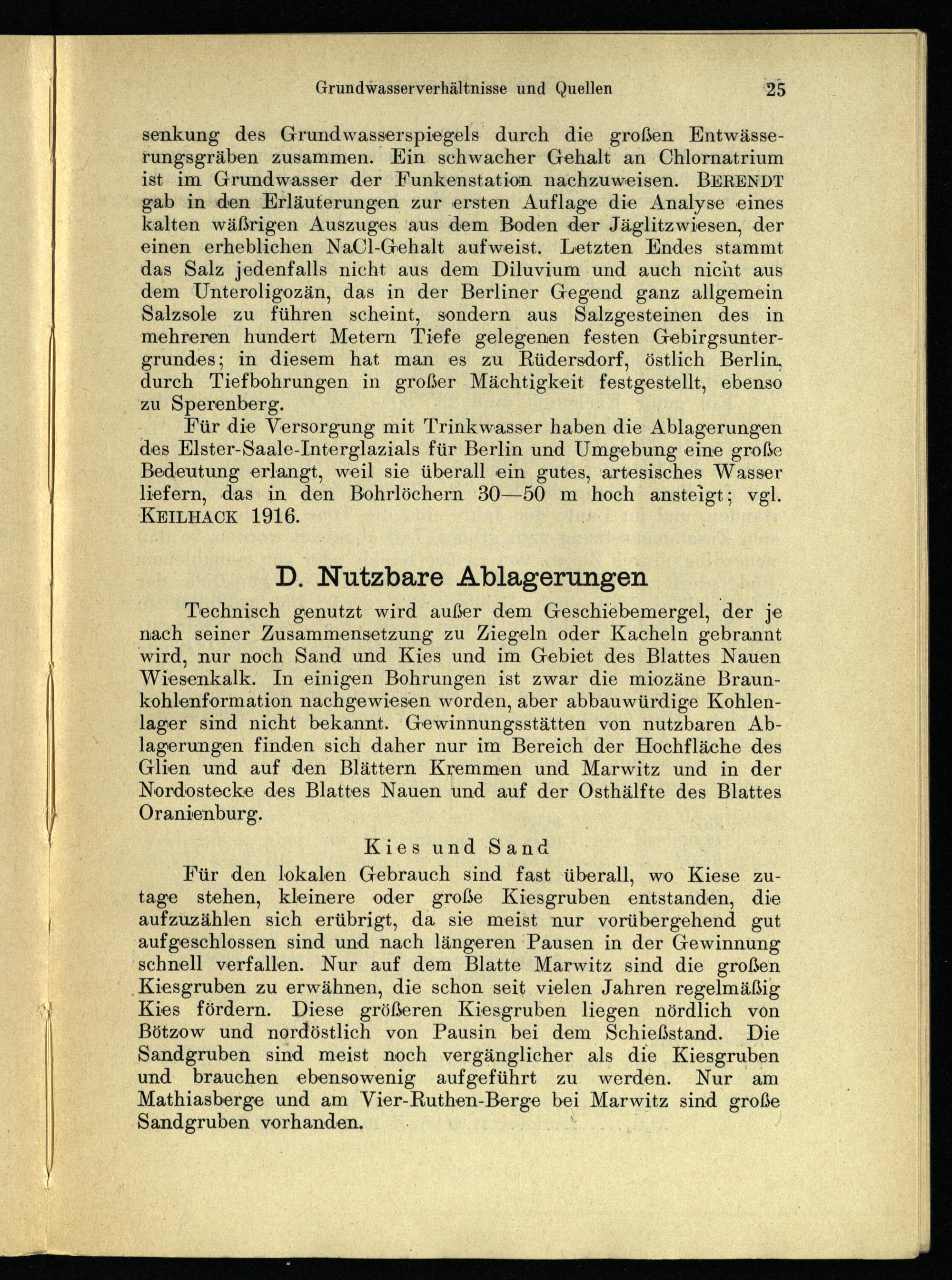 Für die Versorgung mit Trinkwasser haben die Ablagerungen des Elster-Saale- Interglazials für Berlin und Umgebung eine große Bedeutung erlangt, weil sie überall ein gutes, artesisches Wasser liefern, das in den Bohrlöchern 30—50 m hoch ansteigt; vgl. KEILHACK 1916.;