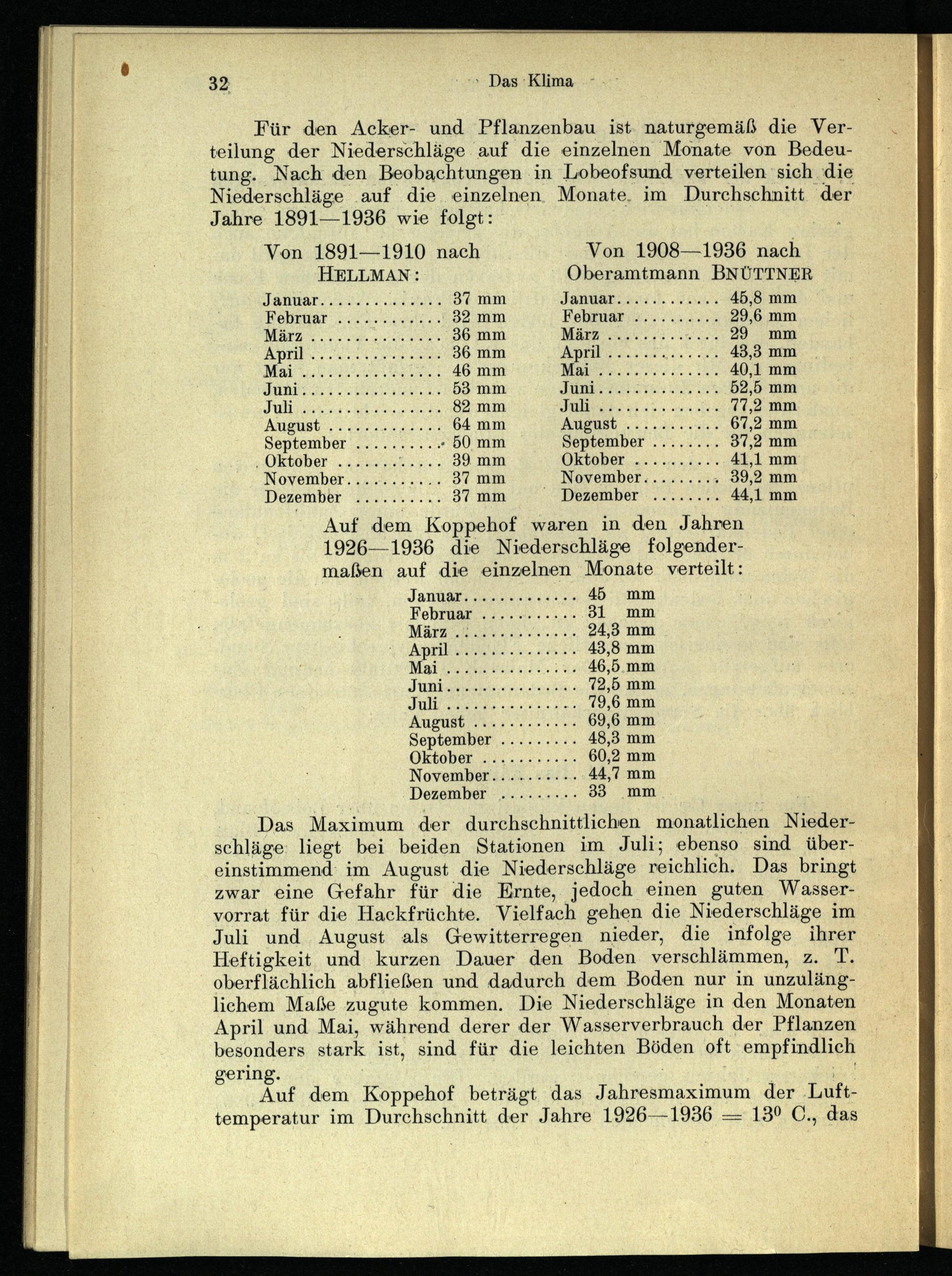 Auf dem Koppehof waren in den Jahren 1926—1936 die Niederschläge folgendermaßen auf die einzelnen Monate verteilt: