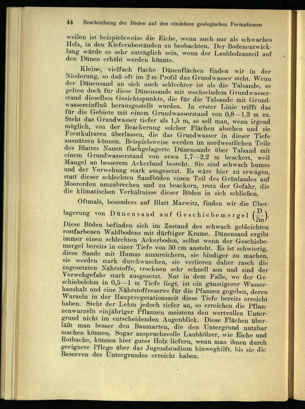 Oftmals, besonders auf Blatt Marwitz, finden wir die Überlagerung von Dünensand auf Geschiebemergel©) Diese Böden befinden sich im Zustand des schwach gebleichten rostfarbenen Waldbodens mit dürftiger Krume. Dünensand ergibt immer einen schlechten Ackerboden, selbst wenn der Geschiebe