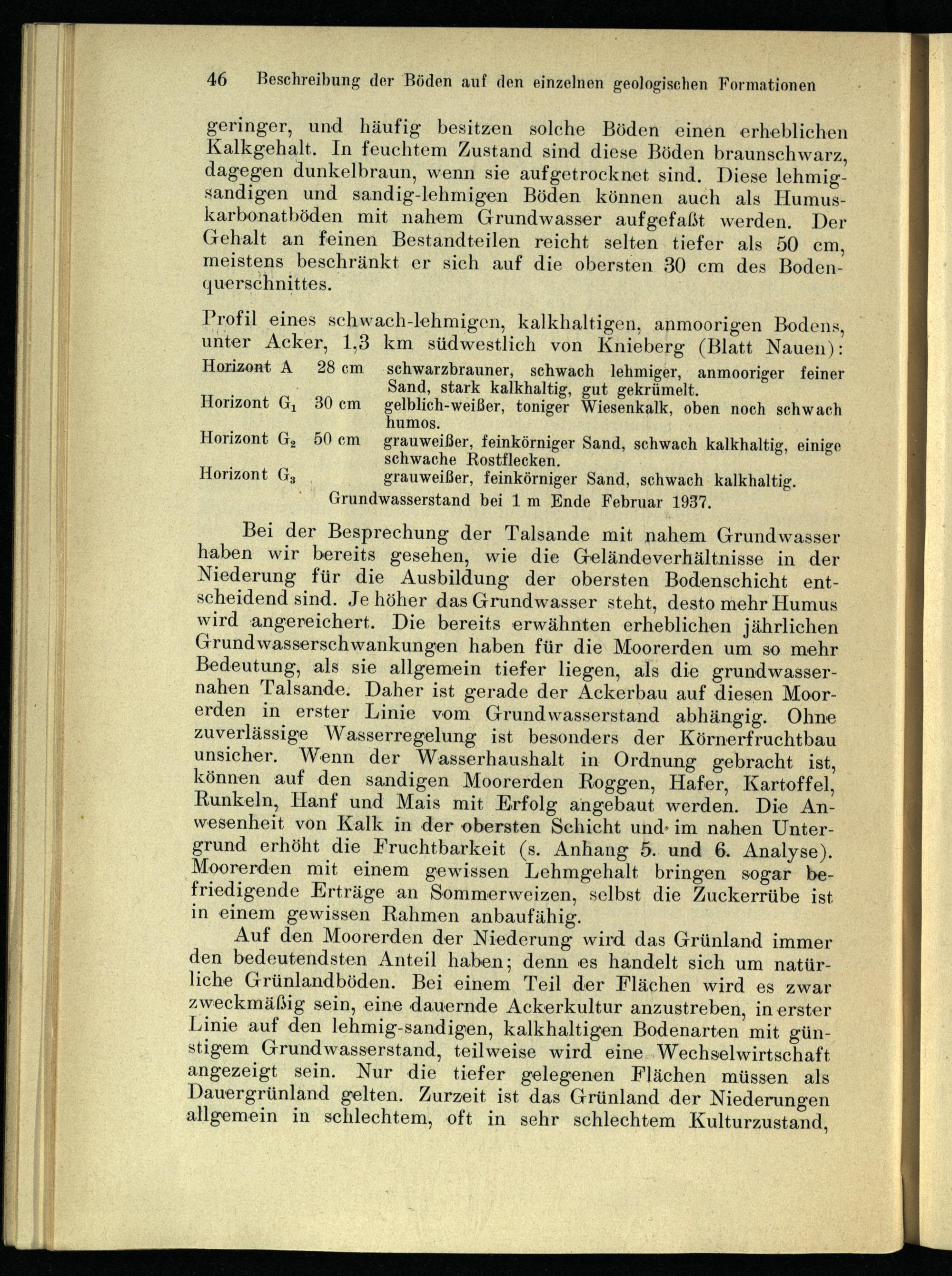 Grundwasserschwankungen haben für die Moorerden um so mehr Bedeutung, als sie allgemein tiefer liegen, als die grund wassernahen Talsande. Daher ist gerade der Ackerbau auf diesen Moorerden in erster Linie vom Grundwasserstand abhängig. Ohne zuverlässige Wasserregelung ist besonders der Körnerfruchtbau unsicher. Wenn der Wasserhaushalt in Ordnung gebracht ist, können auf den sandigen Moorerden Roggen, Hafer, Kartoffel, Runkeln, Hanf und Mais mit Erfolg angebaut werden. Die Anwesenheit von Kalk in der obersten Schicht und- im nahen Untergrund erhöht die Fruchtbarkeit(s. Anhang 5. und 6. Analyse). Moorerden mit einem gewissen Lehmgehalt bringen sogar befriedigende Erträge an Sommerweizen, selbst die Zuckerrübe ist in einem gewissen Rahmen anbaufähig.