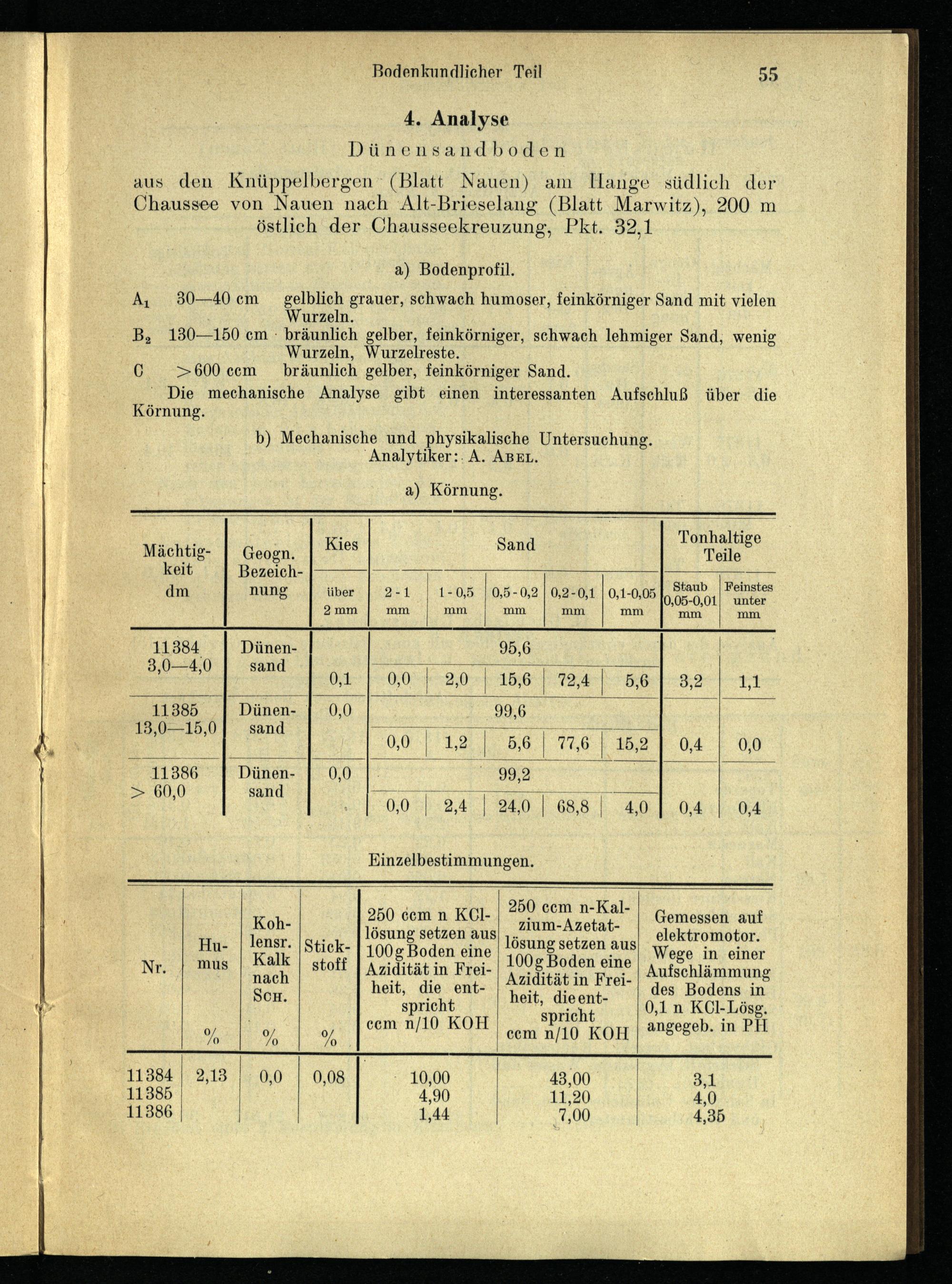 A, 30—40cm gelblich grauer, schwach humoser, feinkörniger Sand mit vielen Wurzeln. B; 130—150 cm- bräunlich gelber, feinkörniger, schwach lehmiger Sand, wenig Wurzeln, Wurzelreste. 6>600ccm bräunlich gelber, feinkörniger Sand. ' Die mechanische Analyse gibt einen interessanten Aufschluß über die Körnung.