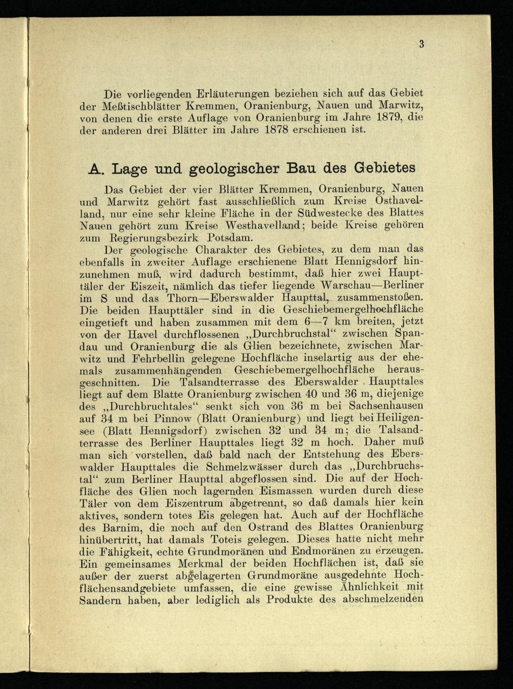 Die vorliegenden Erläuterungen beziehen sich auf das Gebiet der Meßtischblätter Kremmen, Oranienburg, Nauen und Marwitz, von denen die erste Auflage von Oranienburg im Jahre 1879, die der anderen drei Blätter im Jahre 1878 erschienen ist.
