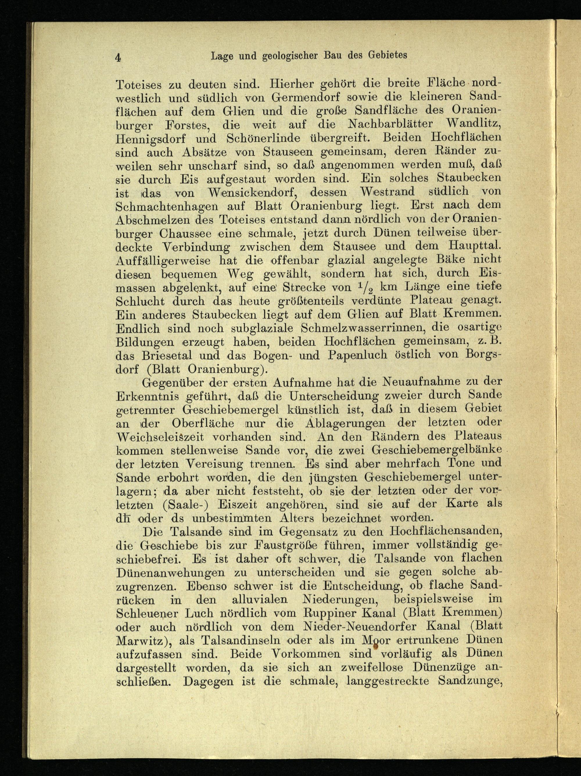 Toteises zu deuten sind. Hierher gehört die breite Fläche.nordwestlich und südlich von Grermendorf sowie die kleineren Sandflächen auf dem Glien und die große Sandfläche des Oranienburger Forstes, die weit auf die Nachbarblätter Wandlitz, Hennigsdorf und Schönerlinde übergreift. Beiden Hochflächen sind auch Absätze von Stauseen gemeinsam, deren Ränder zuweilen sehr unscharf sind, so daß angenommen werden muß, daß sie durch Eis aufgestaut worden sind. Ein solches Staubecken ist das von Wensickendorf, dessen Westrand südlich von Schmachtenhagen auf Blatt Oranienburg liegt. Erst nach dem Abschmelzen des Toteises entstand dann nördlich von der Oranienburger Chaussee eine schmale, jetzt durch Dünen teilweise überdeckte Verbindung zwischen dem Stausee und dem Haupttal. Auffälligerweise hat die offenbar glazial angelegte Bäke nicht diesen bequemen Weg gewählt, sondern hat sich, durch MKismassen abgelenkt, auf eine Strecke von 1/» km Länge eine tiefe Schlucht durch das heute größtenteils verdünte Plateau genagt. Ein anderes Staubecken liegt auf dem Glien auf Blatt Kremmen. Endlich sind noch subglaziale Schmelzwasserrinnen, die osartige Bildungen erzeugt haben, beiden Hochflächen gemeinsam, z.B. das Briesetal und das Bogen- und Papenluch östlich von Borgsdorf(Blatt Oranienburg).