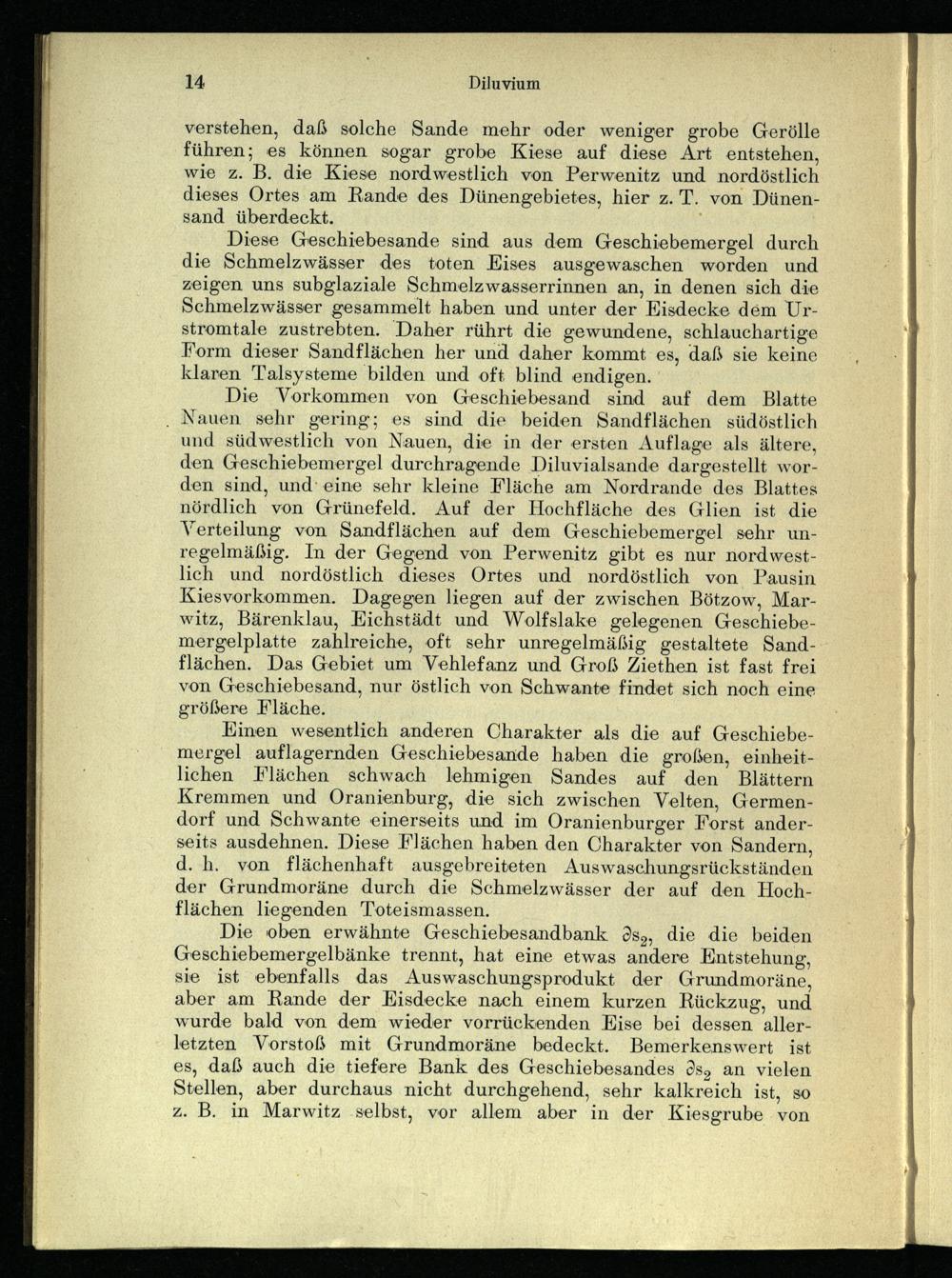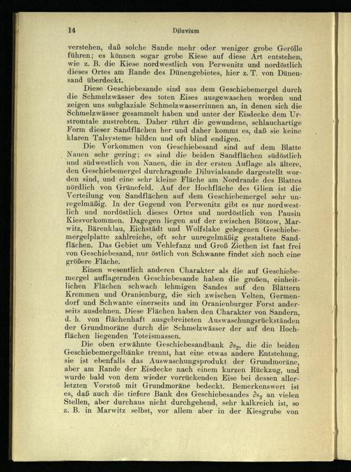 verstehen, daß solche Sande mehr oder weniger grobe Gerölle führen; es können sogar grobe Kiese auf diese Art entstehen, wie z. B. die Kiese nordwestlich von Perwenitz und nordöstlich dieses Ortes am Rande des Dünengebietes, hier z. T. von Dünensand überdeckt.)