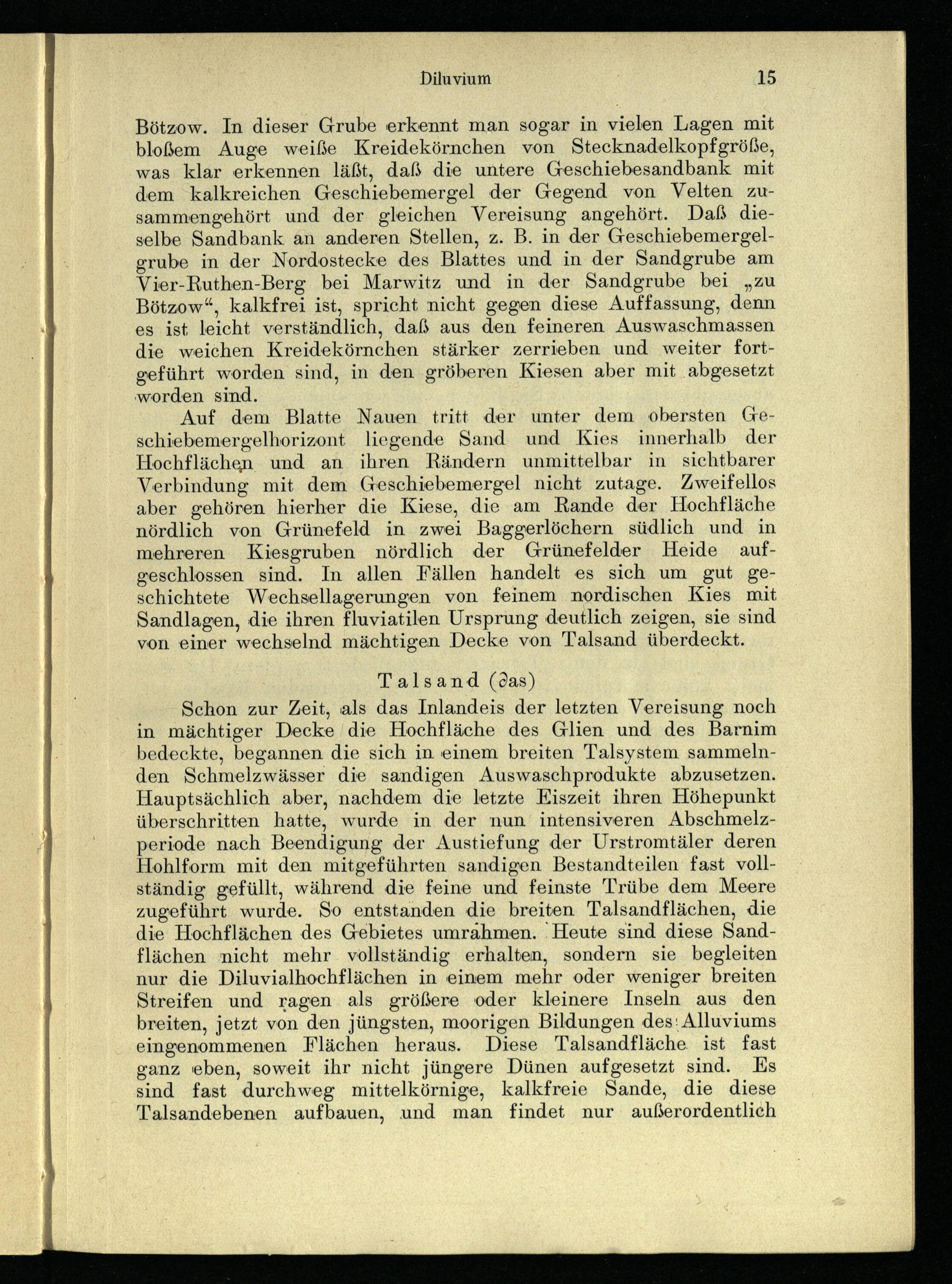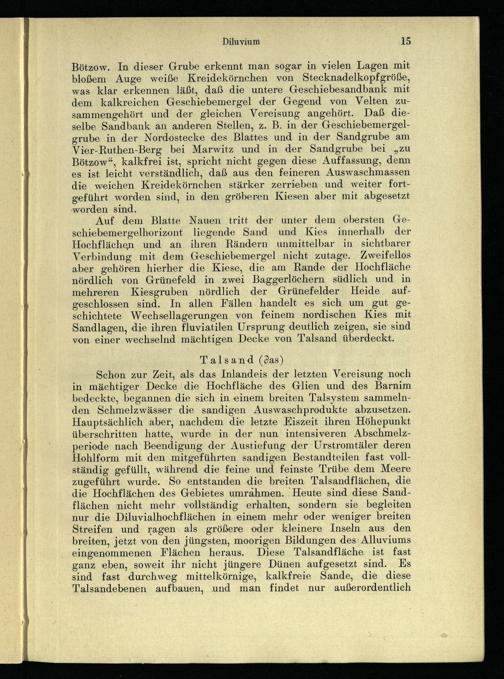 Auf dem Blatte Nauen tritt der unter dem obersten Geschiebemergelhorizont liegende Sand und Kies innerhalb der Hochflächen. und an ihren Rändern unmittelbar in sichtbarer Verbindung mit dem Geschiebemergel nicht zutage. Zweifellos aber gehören hierher die Kiese, die am Rande der Hochfläche nördlich von Grünefeld in zwei Baggerlöchern südlich und in mehreren Kiesgruben nördlich der Grünefelder Heide aufgeschlossen sind. In allen Fällen handelt es sich um gut geschichtete Wechsellagerungen von feinem nordischen Kies mit Sandlagen, die ihren fluviatilen Ursprung deutlich zeigen, sie sind von einer wechselnd mächtigen Decke von Talsand überdeckt.