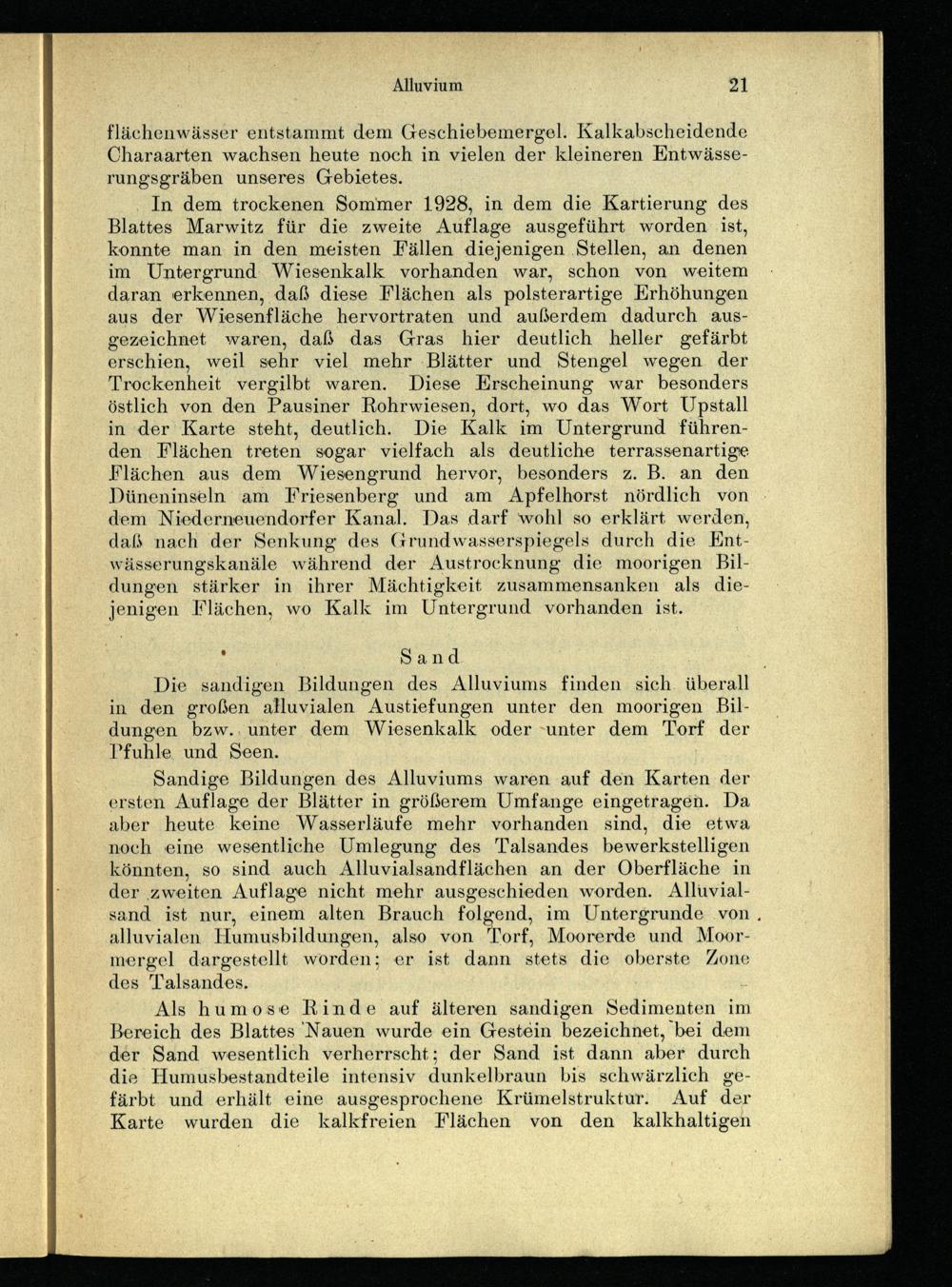 Sandige Bildungen des Alluviums waren auf den Karten der ersten Auflage der Blätter in größerem Umfange eingetragen. Da aber heute keine Wasserläufe mehr vorhanden sind, die etwa noch eine wesentliche Umlegung des Talsandes bewerkstelligen könnten, so sind auch Alluvialsandflächen an der Oberfläche in der zweiten Auflage nicht mehr ausgeschieden worden. Alluvialsand ist nur, einem alten Brauch folgend, im Untergrunde von, alluvialen Humusbildungen, also von"Torf, Moorerde und Moormergel dargestellt worden; er ist dann stets die oberste Zone des Talsandes.
