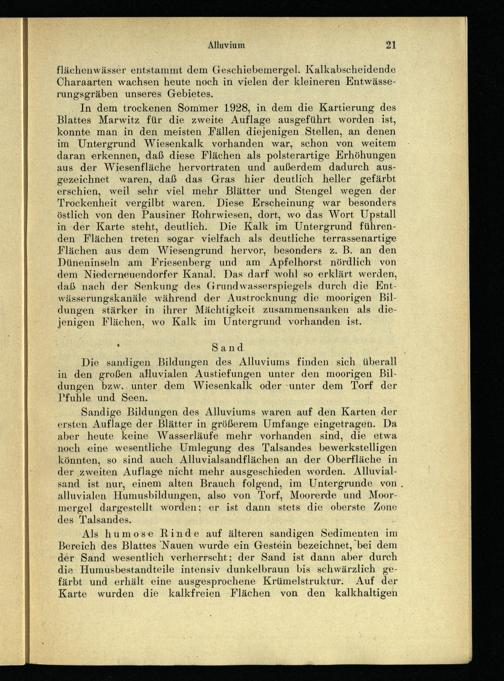In dem trockenen Sommer 1928, in dem die Kartierung des Blattes Marwitz für die zweite Auflage ausgeführt worden. ist, konnte man in den meisten Fällen diejenigen ‚Stellen, an denen im Untergrund Wiesenkalk vorhanden war, schon von weitem daran erkennen, daß diese Flächen als polsterartige Erhöhungen aus der Wiesenfläche hervortraten und außerdem dadurch ausgezeichnet waren, daß das Gras hier deutlich heller gefärbt erschien, weil sehr viel mehr ‚Blätter und Stengel wegen der Trockenheit vergilbt waren. Diese Erscheinung war besonders östlich von den Pausiner Rohrwiesen, dort, wo das Wort Upstall in der Karte steht, deutlich. Die Kalk im Untergrund führenden Flächen treten sogar vielfach als deutliche terrassenartige Flächen aus dem Wiesengrund hervor, besonders z. B. an den Düneninseln‘ am Friesenberg und am Apfelhorst nördlich von dem Niederneuendorfer Kanal. Das darf wohl so erklärt werden, daß nach der Senkung des Grundwasserspiegels durch die KEntwässerungskanäle während der Austrocknung die moorigen Bildungen stärker in ihrer Mächtigkeit zusammensanken als diejenigen Flächen, wo Kalk im Untergrund vorhanden ist.