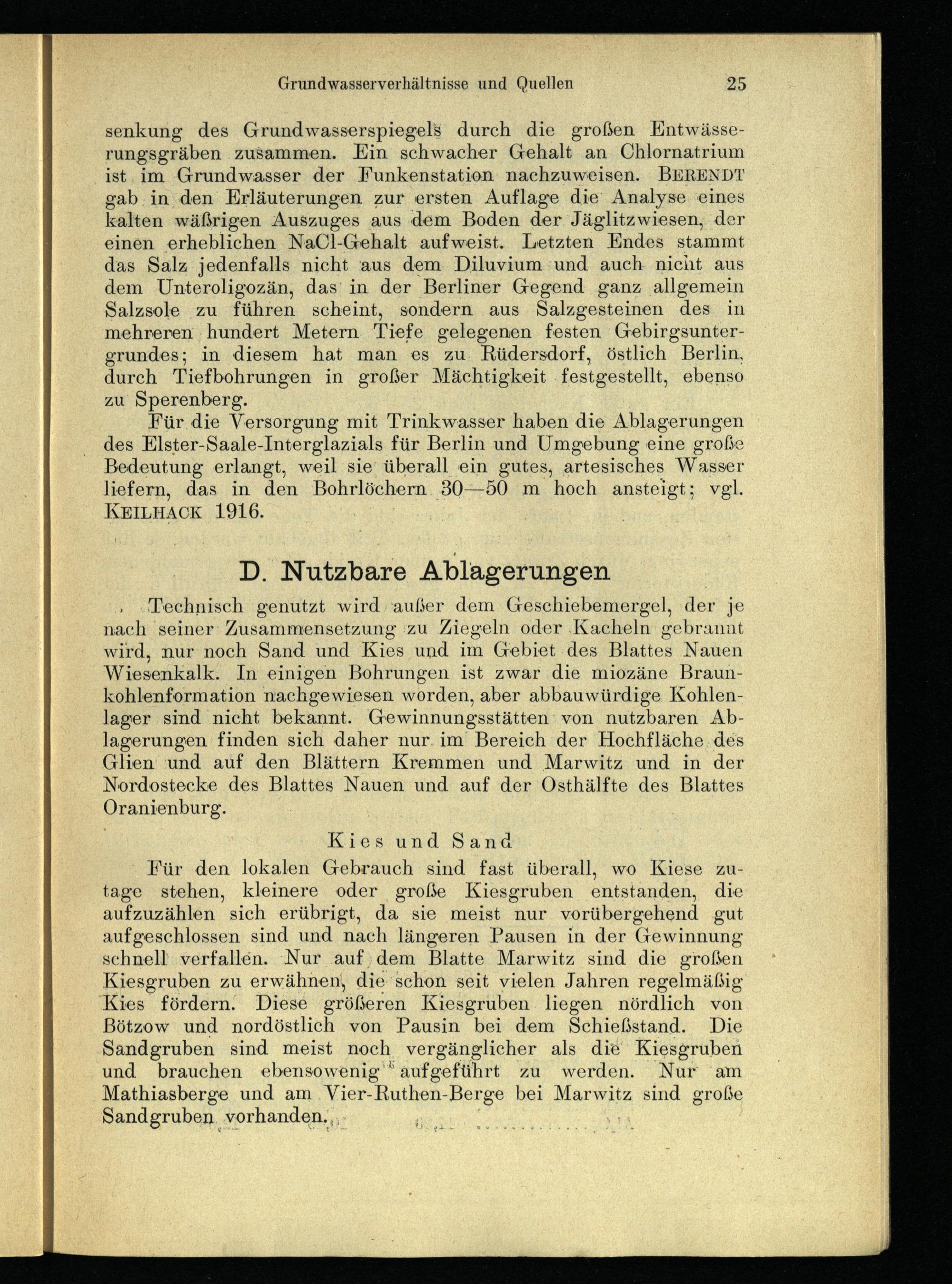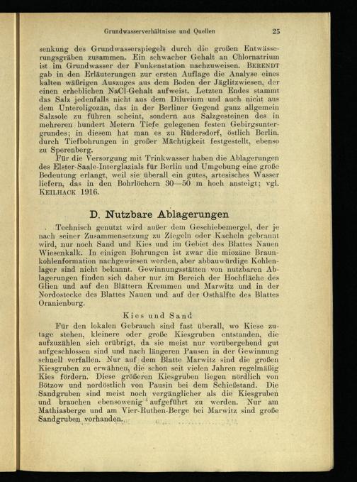 Für die Versorgung mit Trinkwasser haben die Ablagerungen des Elster-Saale-Interglazials für Berlin und Umgebung eine große Bedeutung erlangt, weil sie‘ überall ein gutes, artesisches Wasser liefern, das in den Bohrlöchern 30—50 m hoch ansteigt; vgl. KEILHACK 1916.
