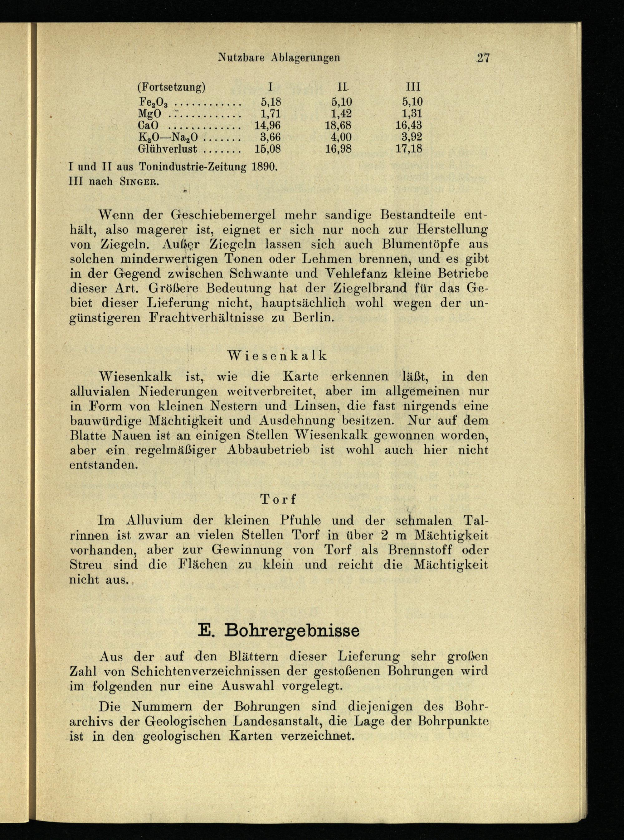 (Fortsetzung) IL Hi 5,10 5,10 1,42 41,81 18,68 16,48 4,00 3,92 Glühverlust 16,98 17,18 I und II aus Tonindustrie-Zeitung 1890. III nach SINGER.