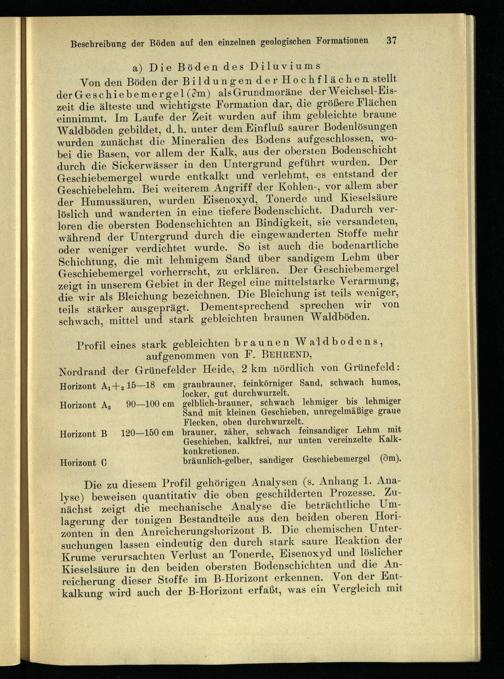 Die zu diesem Profil gehörigen Analysen(s. Anhang 1. Analyse) beweisen quantitativ die oben geschilderten Prozesse. Zunächst zeigt die mechanische Analyse die beträchtliche Umlagerung der tonigen Bestandteile aus den beiden oberen Horizonten in den Anreicherungshorizont B. Die chemischen Untersuchungen lassen eindeutig den durch stark saure Reaktion der Krume verursachten Verlust an Tonerde, Eisenoxyd und löslicher Kieselsäure in den beiden obersten Bodenschichten und die Anreicherung dieser Stoffe im B-Horizont erkennen. Von der Entkalkung wird auch der B-Horizont erfaßt, was ein Vergleich mit