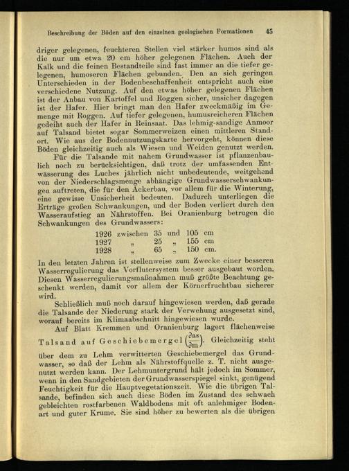 Für die Talsande mit nahem Grundwasser ist pflanzenbaulich noch zu berücksichtigen, daß trotz der umfassenden KEntwässerung des Luches jährlich nicht unbedeutende, weitgehend von der Niederschlagsmenge abhängige Grundwasserschwankungen auftreten, die für den Ackerbau, vor allem für die Winterung, eine gewisse Unsicherheit bedeuten. Dadurch unterliegen die Erträge großen Schwankungen, und der Boden verliert durch den Wasseraufstieg an Nährstoffen. Bei Oranienburg betrugen die Schwankungen des Grundwassers: