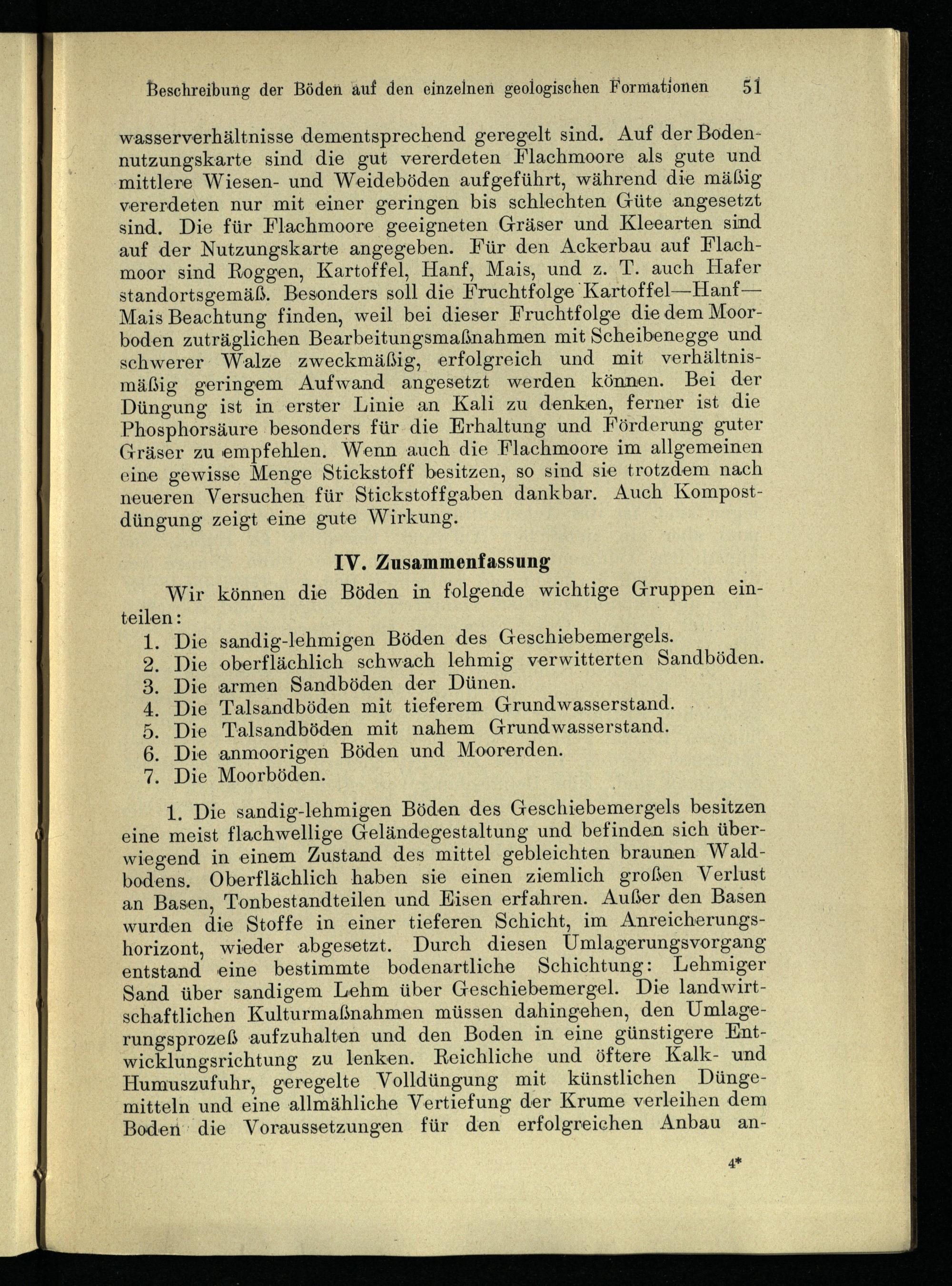 IV. Zusammenfassung Wir können die Böden in folgende wichtige Gruppen einteilen: . Die sandig-lehmigen Böden des Geschiebemergels.