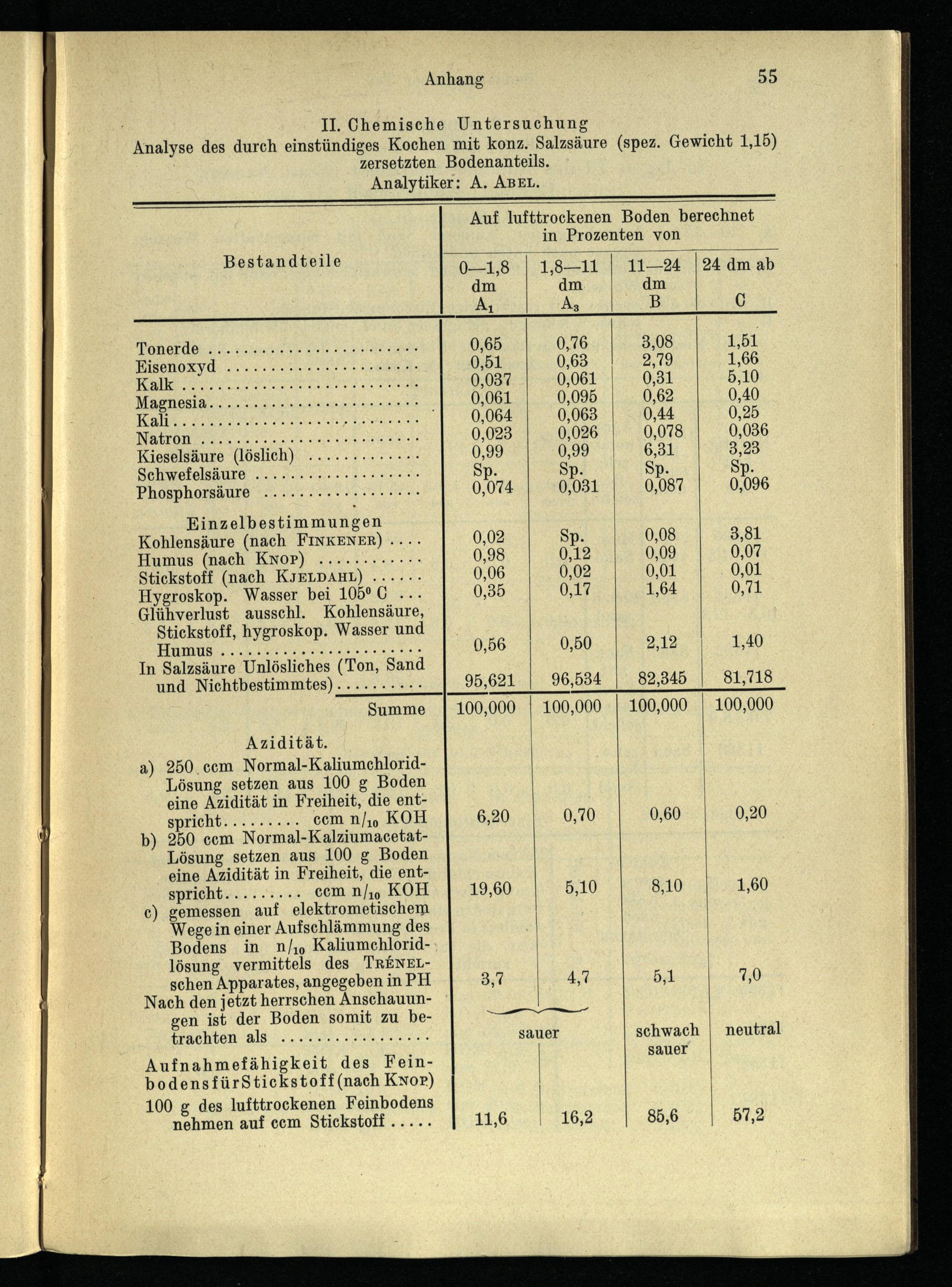 II. Chemische Untersuchung Analyse des durch einstündiges Kochen mit konz. Salzsäure(spez. Gewicht 1,15) zersetzten Bodenanteils. Analytiker: A. ABEL. Auf lufttrockenen Boden berechnet in Prozenten von