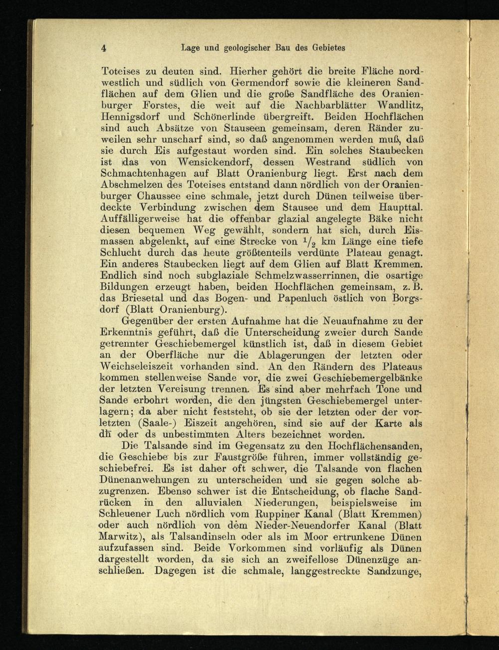 Toteises zu deuten sind. Hierher gehört die breite Fläche nordwestlich und südlich von Germendorf sowie die kleineren Sandflächen auf dem Glien und die große Sandfläche des Oranienburger Forstes, die weit auf die Nachbarblätter Wandlitz, Hennigsdorf und Schönerlinde übergreift. Beiden Hochflächen sind auch Absätze von Stauseen gemeinsam, deren Ränder zuweilen sehr unscharf sind, so daß angenommen werden muß, daß sie durch Eis aufgestaut worden sind. Ein solches Staubecken ist idas von Wensickendorf, dessen Westrand südlich von Schmachtenhagen auf Blatt Oranienburg liegt. Erst nach dem Abschmelzen des Toteises entstand dann nördlich von der Oranienburger Chaussee eine schmale, jetzt durch Dünen teilweise überdeckte Verbindung zwischen dem Stausee und dem Haupttal. Auffälligerweise hat die offenbar glazial angelegte Bäke nicht diesen bequemen Weg gewählt, sondern hat sich, durch Kismassen abgelenkt, auf eine Strecke von 1/, km Länge eine tiefe Schlucht durch das heute größtenteils verdünte Plateau genagt. Ein anderes Staubecken liegt auf dem Glien auf Blatt Kremmen. Endlich sind noch subglaziale Schmelzwasserrinnen, die osartige Bildungen erzeugt haben, beiden Hochflächen gemeinsam, z.B. das Briesetal und das Bogen- und Papenluch östlich von Borgsdorf(Blatt Oranienburg).