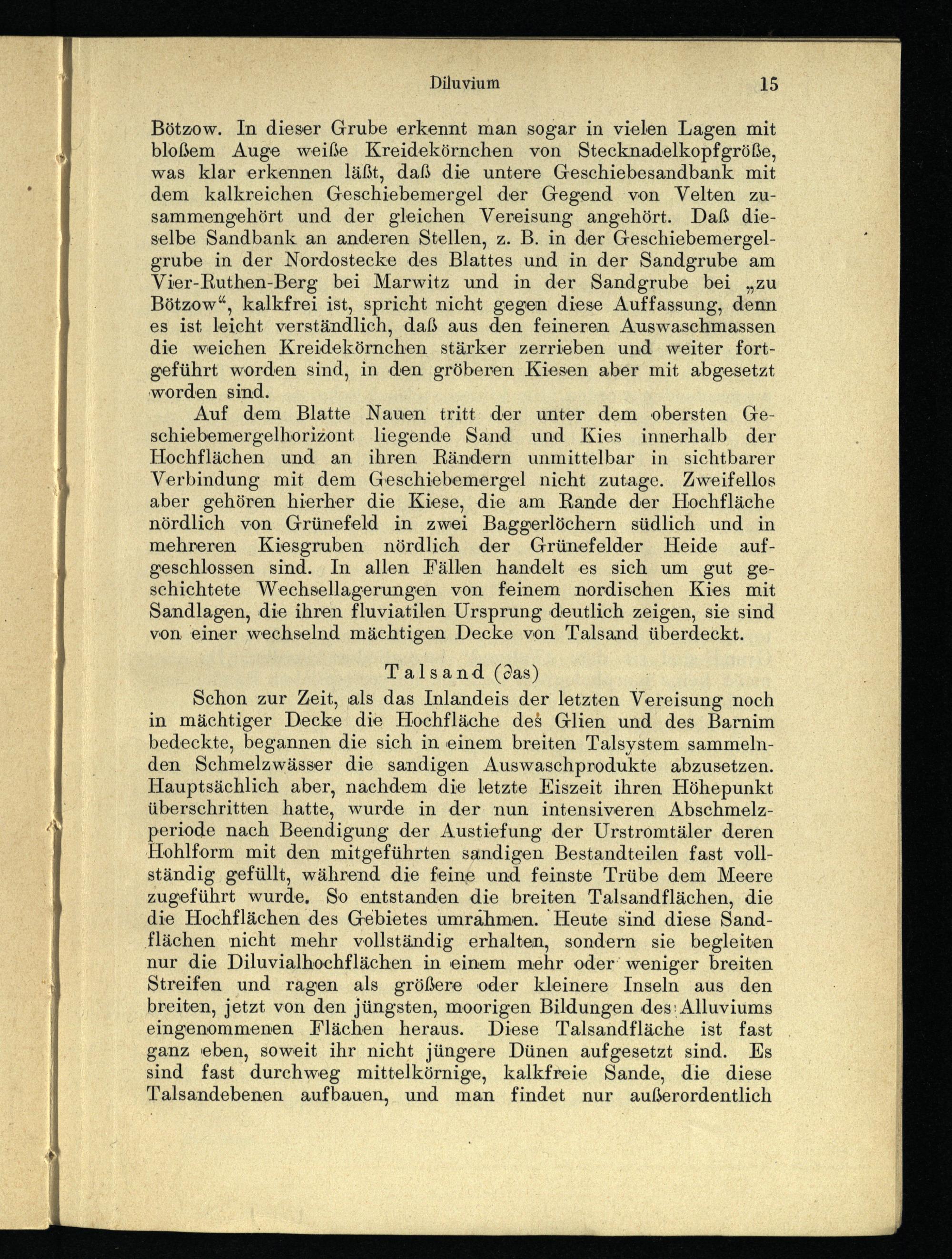 Schon zur Zeit, als das Inlandeis der letzten Vereisung noch in mächtiger Decke die Hochfläche des Glien und des Barnim bedeckte, begannen die sich in einem breiten Talsystem sammelnden Schmelzwässer die sandigen Auswaschprodukte abzusetzen. Hauptsächlich aber, nachdem die letzte Eiszeit ihren Höhepunkt überschritten hatte, wurde in der: nun intensiveren Abschmelzperiode nach Beendigung der Austiefung der Urstromtäler deren Hohlform mit den mitgeführten sandigen Bestandteilen fast vollständig gefüllt, während die feine und feinste Trübe dem Meere zugeführt wurde, So entstanden die breiten Talsandflächen, die die Hochflächen des Gebietes umrahmen. Heute sind diese Sandflächen nicht mehr vollständig erhalten, sondern sie begleiten nur die Diluvialhochflächen in einem mehr oder‘ weniger breiten Streifen und ragen als größere oder kleinere Inseln aus den breiten, jetzt von den jüngsten, moorigen Bildungen des: Alluviums eingenommenen. Flächen heraus. Diese Talsandfläche ist fast ganz eben, soweit ihr nicht jüngere Dünen aufgesetzt sind. Es sind fast durchweg mittelkörnige, kalkfreie Sande, die diese Talsandebenen aufbauen, und man findet nur außerordentlich