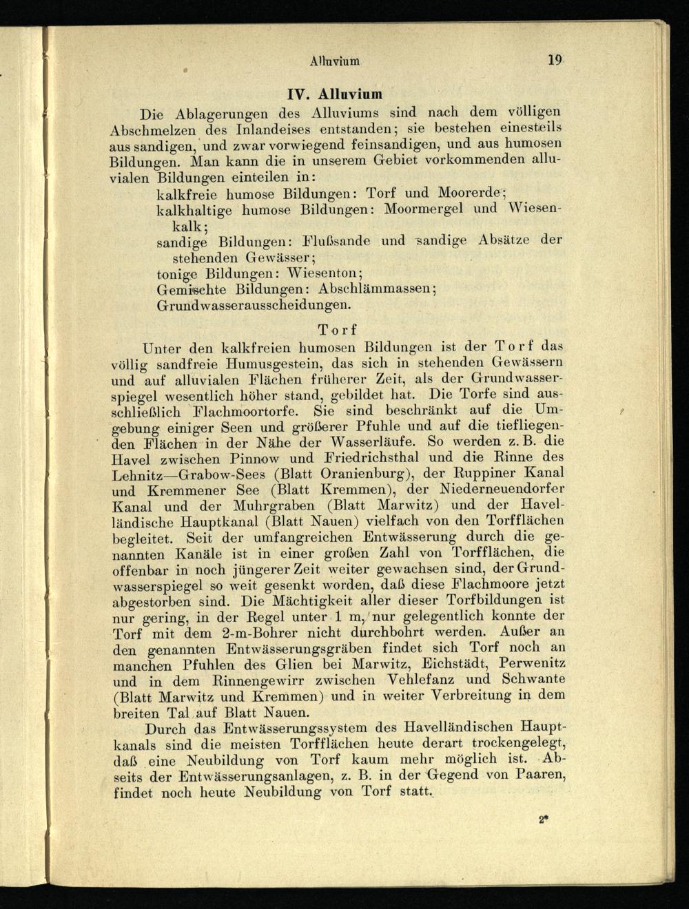 IV. Alluvium Die Ablagerungen des Alluviums sind nach dem völligen Abschmelzen des Inlandeises entstanden; sie bestehen einesteils aus sandigen, und zwar vorwiegend feinsandigen, und aus humosen Bildungen. Man kann die in unserem Gebiet vorkommenden alluvialen Bildungen einteilen in: kalkfreie humose Bildungen: Torf und Moorerde‘; kalkhaltige humose Bildungen: Moormergel und Wiesenkalk; sandige Bildungen: Flußsande und sandige Absätze der stehenden Gewässer; tonige Bildungen: Wiesenton; Gemischte Bildungen: Abschlämmassen; Grund wasserausscheidungen.