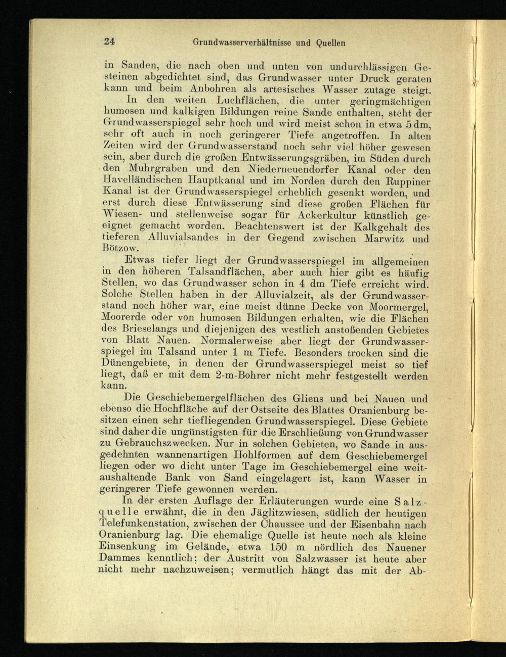 In den weiten Luchflächen, die unter geringmächtigen humosen und kalkigen Bildungen reine Sande enthalten, steht der Grundwasserspiegel sehr hoch und wird meist schon in etwa 5 dm, sehr oft auch in noch geringerer Tiefe angetroffen. In alten Zeiten wird der Grundwasserstand noch sehr viel höher gewesen sein, aber durch die großen Entwässerungsgräben, im Süden durch ‚den Muhrgraben und den Niederneuendorfer Kanal oder den Havelländischen Hauptkanal und im Norden durch den Ruppiner Kanal ist der Grundwasserspiegel erheblich gesenkt worden, und erst durch diese Entwässerung sind diese großen Flächen für Wiesen- und stellenweise sogar für Ackerkultur künstlich geeignet gemacht worden. Beachtenswert ist der Kalkgehalt des tieferen Alluvialsandes in der Gegend zwischen Marwitz und Bötzow.;